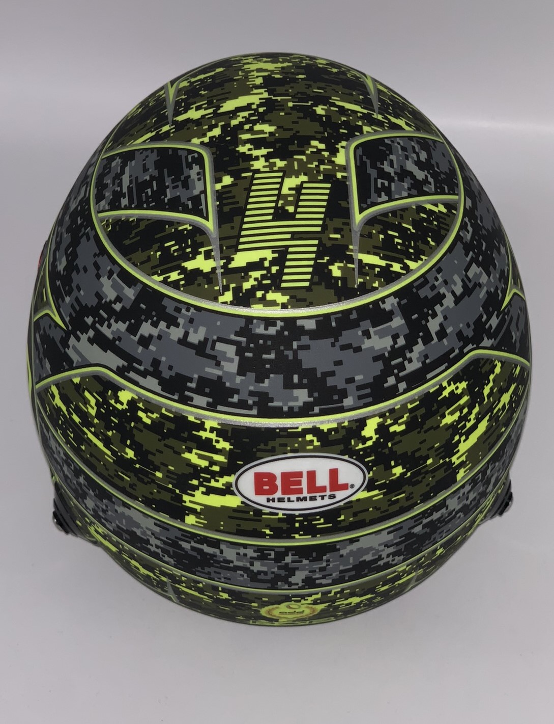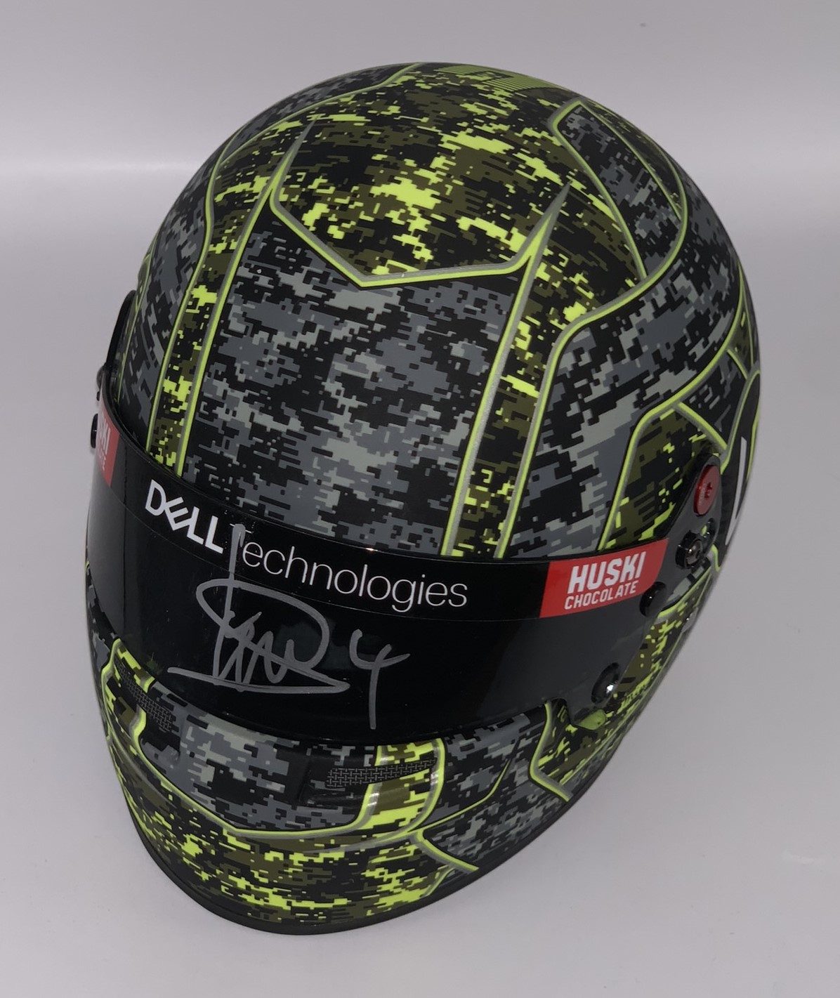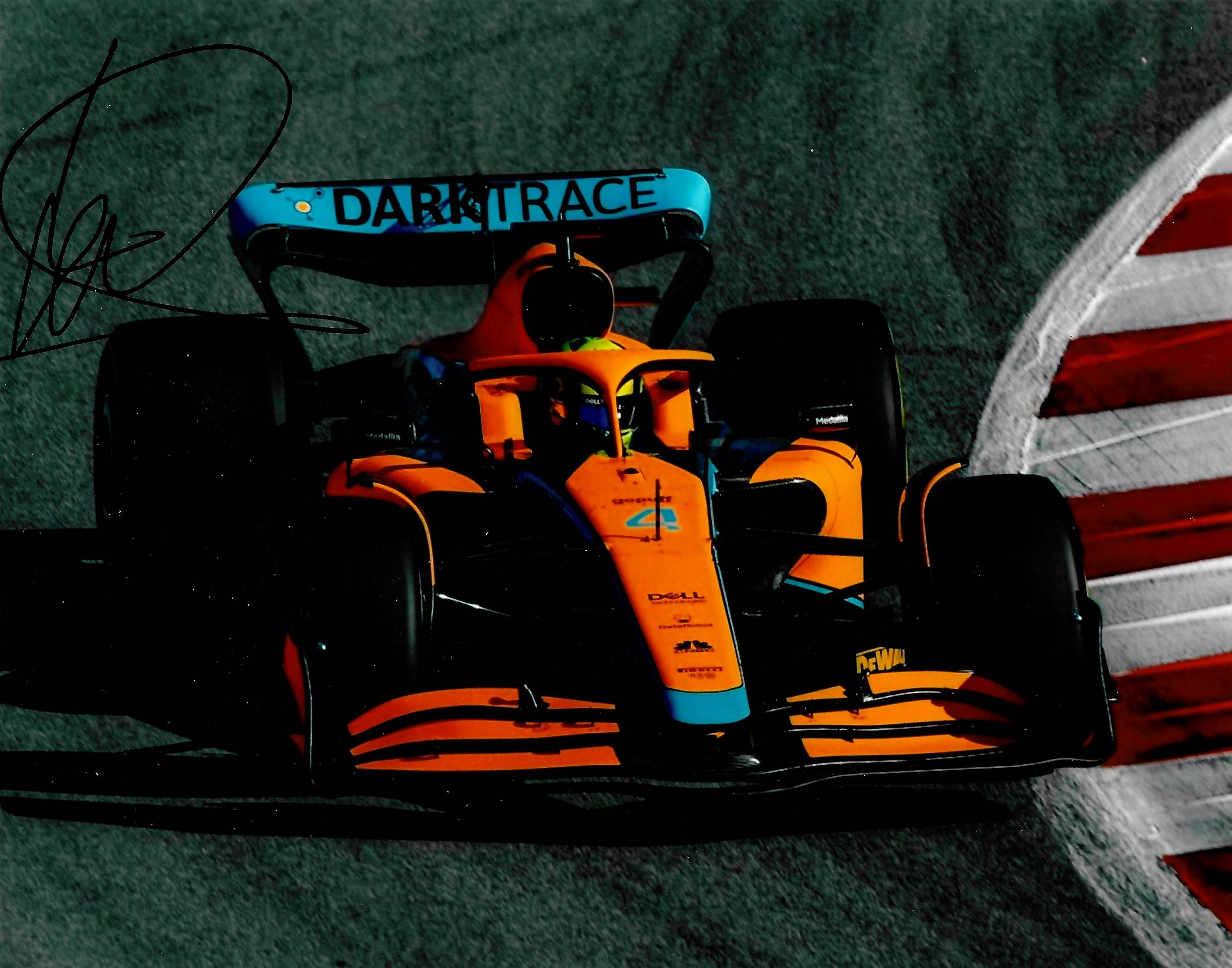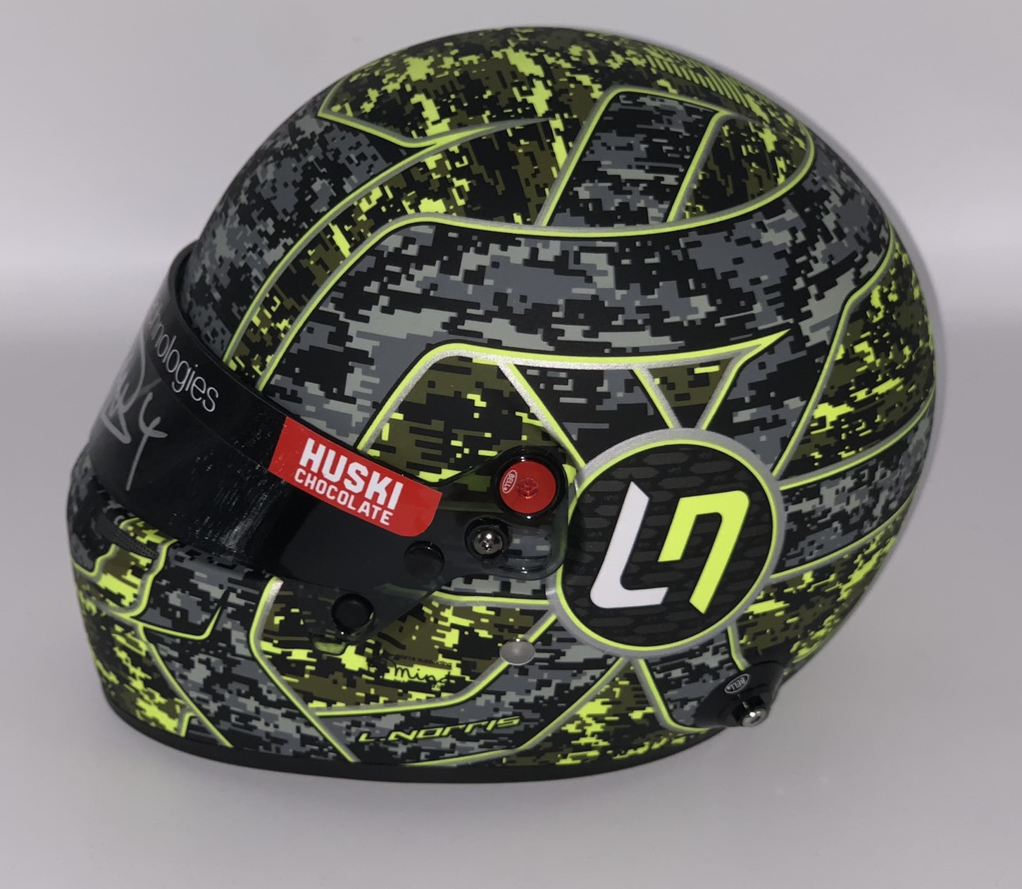 Lando Norris (UK) signed McLaren F1 ½ scale helmet (2021 Glitch) 2021 Test Helmet, Signed on Visor with Silver Sharpie. Includes signed 8 by 10in. action photograph of Lando Norris in 2022 McLaren. Comes with exact photo proof an COA. (2)