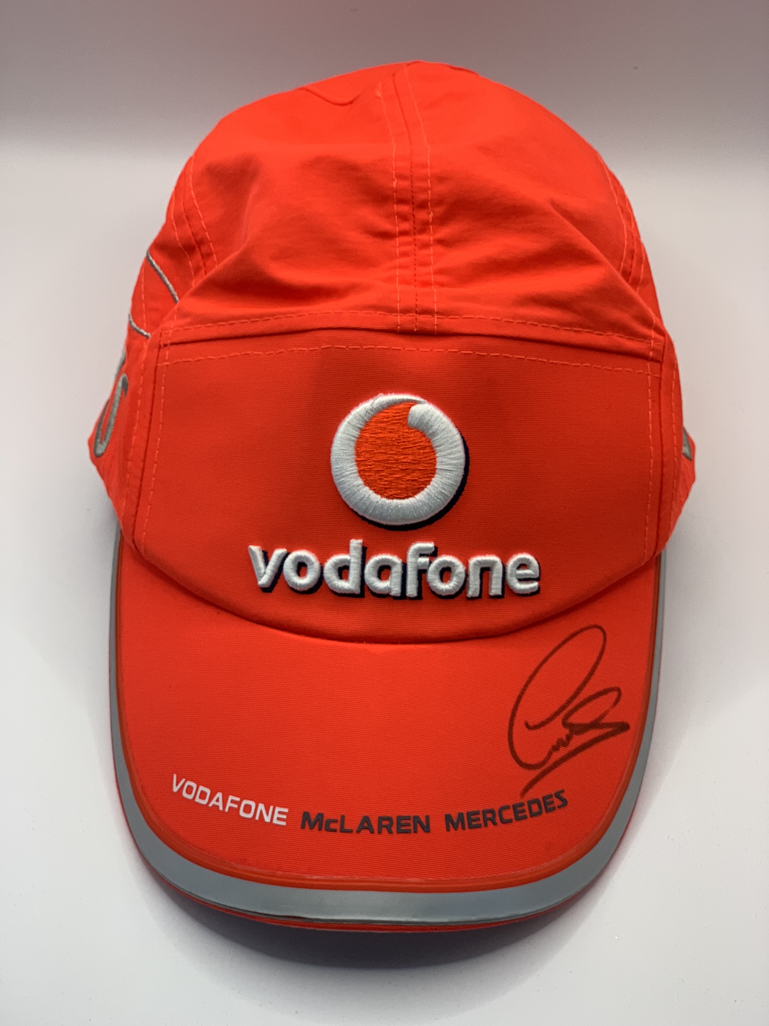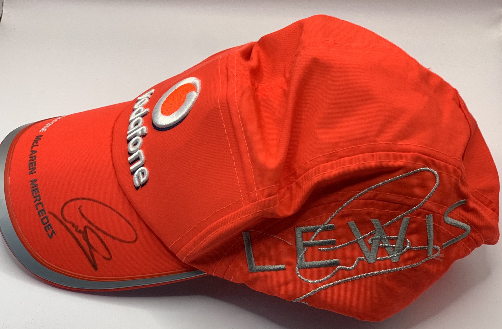 Lewis Hamilton (UK) signed Vodafone McLaren-Mercedes silver cap, signed in black permanent marker on peak. Hamilton achieved his first F1 World Championship racing for McLaren-Mercedes in 2008. Comes with exact photo proof of cap being signed and COA.