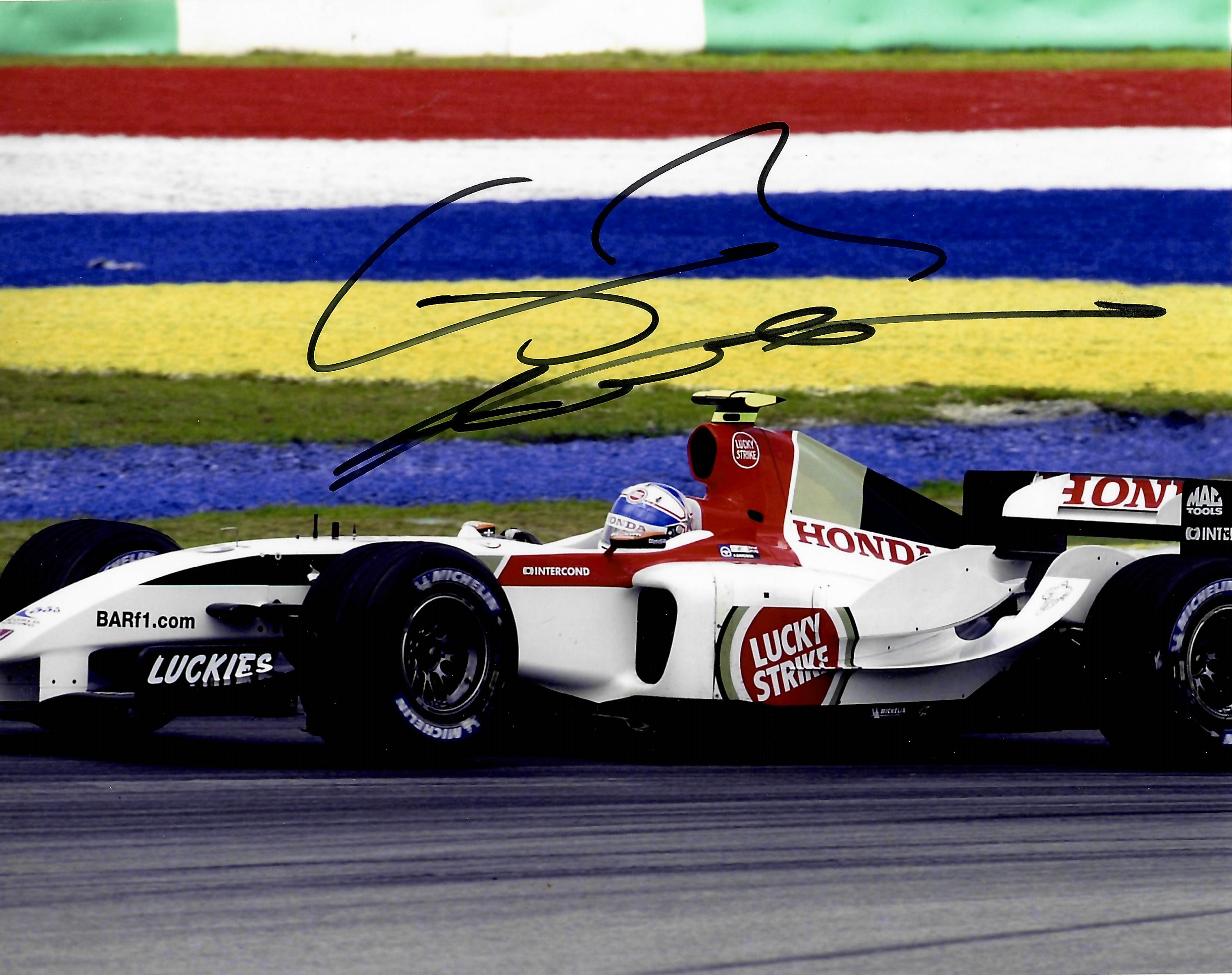Jenson Button (UK) signed Honda Bar cap, signed in black permanent marker on peak. Button drove for Honda Bar from 2003-2008. Button then won his F1 World Championship in 2009 for Brawn racing. Also includes two action signed 8 by 10in. signed photographs by Button, one when racing for Honda Bar and one in his championship year for Brawn Racing. Both items come with exact photo proof being signed and COA. (4)