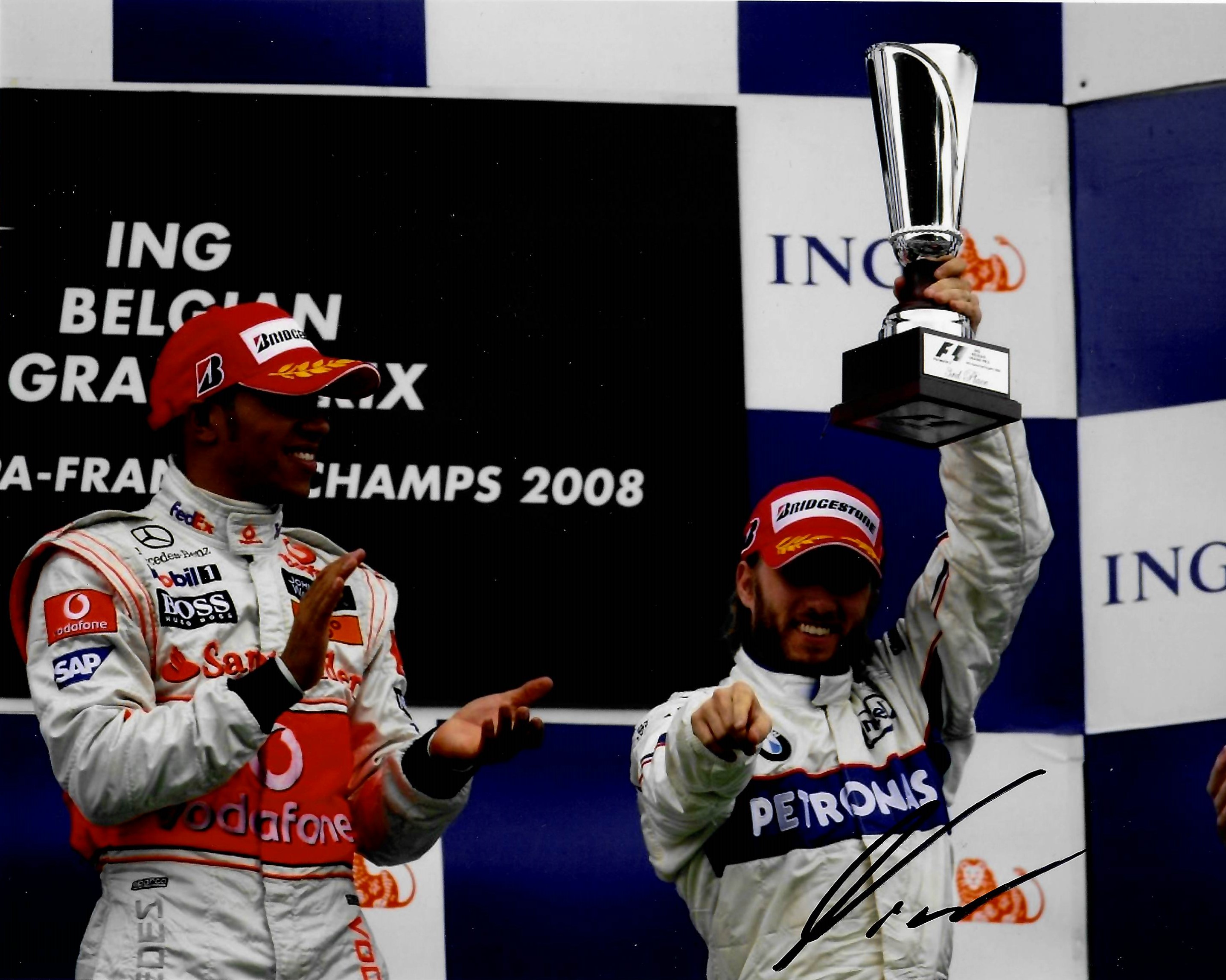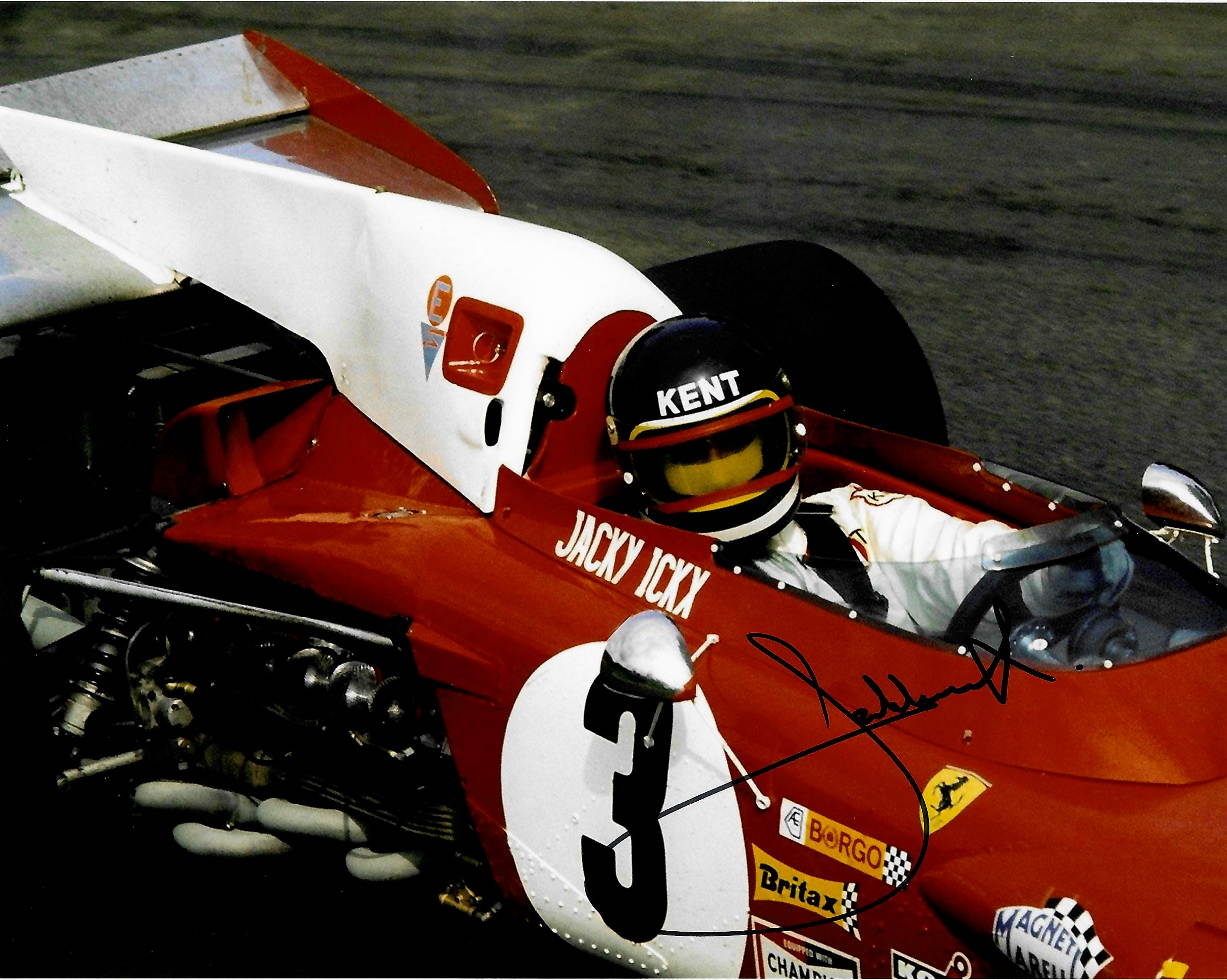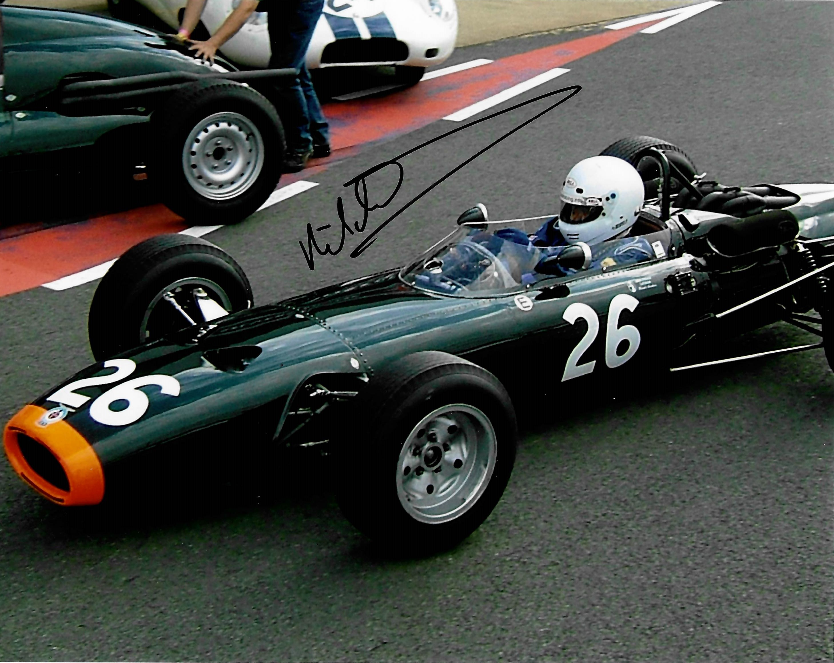 Collection of 13 F1 Legends and former F1 drivers hand signed 8 by 10in. photographs, including René Arnoux (1978-1989 F1 including 7 race wins), Jacky Ickx (1966-1979 F1), Jochen Mass (1973-1982 F1 including win in 1975 Spanish F1), Arturo "Art" Merzario (1972-1979 F1), John Watson MBE (1973-1985 including 5 F1 race wins), Derek Bell MBE (1968-1974 F1), Richard Attwood (1964-1969 F1), Karun Chandhok (2014-2015 F1), Nick Heidfeld (2000-2011 F1), Esteban Gutiérrez (2013-2016 F1), Johhny Herbert (1989-2000 F1, including 3 F1 race wins), Giancarlo Fisichella (1996-2009 F1, 3 race wins). Filipe Massa (2002-2017 F1, 11 Race wins). Comes COA and photo proof. (13)