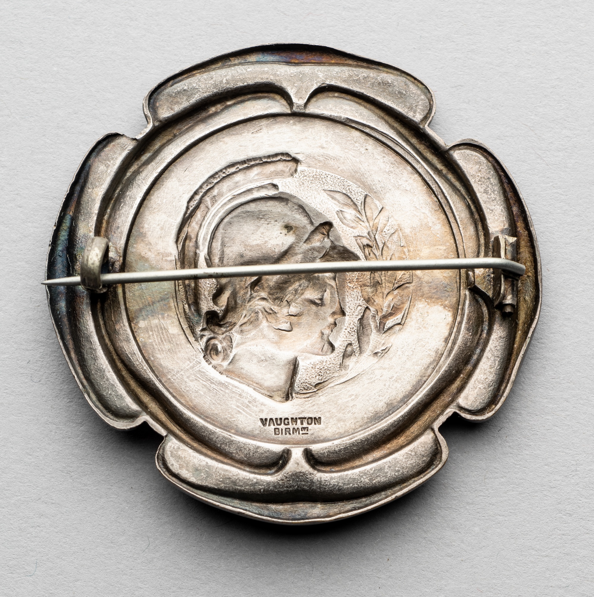 London 1908 Olympic Games Umpire badge, the silvered bronze badge featuring the head of Athena surrounded by OLYMPIC GAMES LONDON 1908 UMPIRE in a blue enamel band, reverse with lapel pin clasp and stamped VAUGHTON BIRM, diameter 57mm., condition is good, slight pitting to enamel