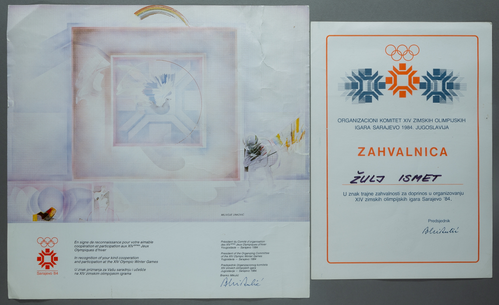 Sarajevo 1984 Winter Olympic Games participant's diploma, unawarded; sold together with an Organising Committee certificate of thanks to Zulj Ismet,