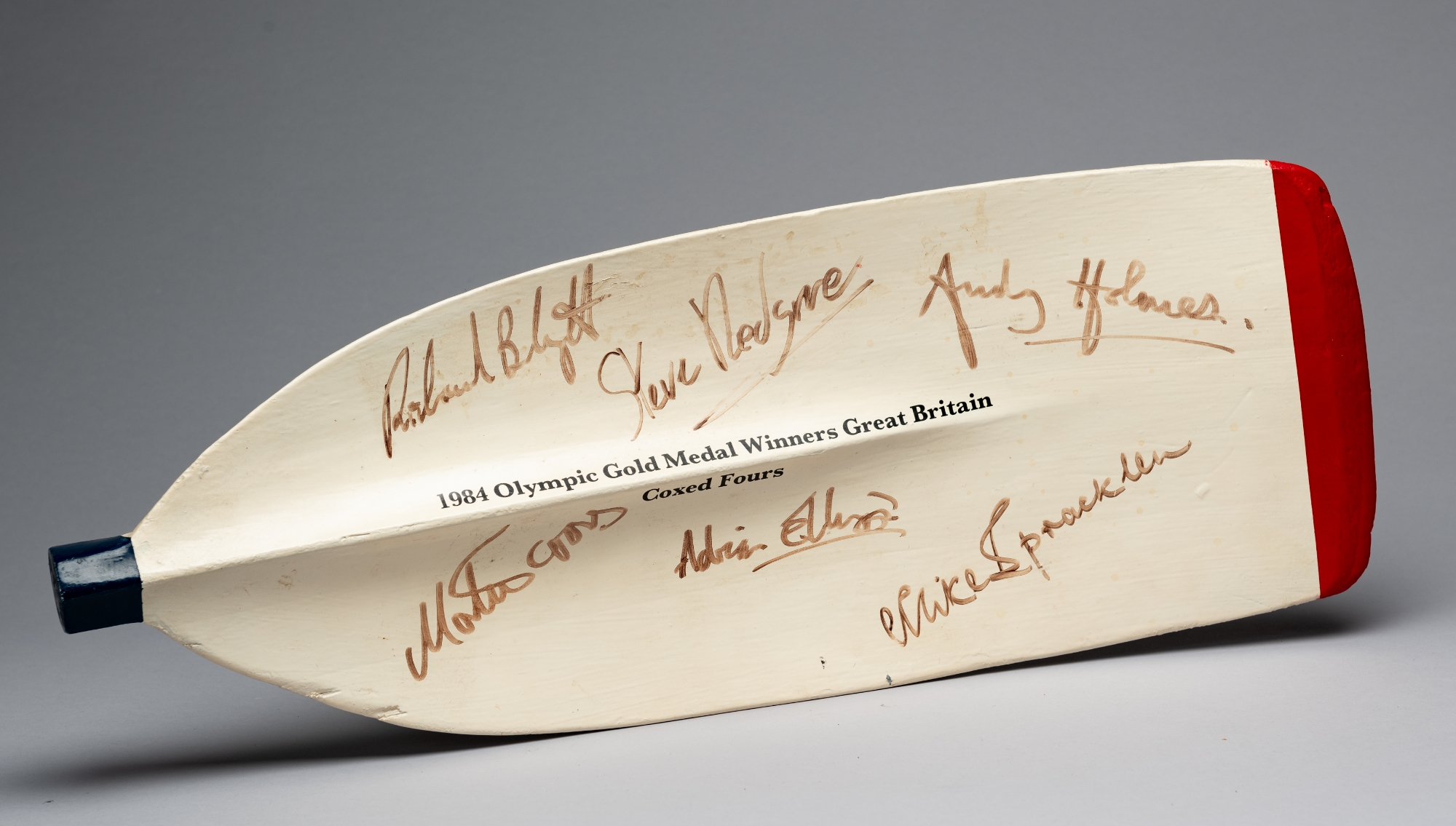 Great Britain Coxed Four Los Angeles 1984 Olympic Games gold medal winners signed rowing blade, cream, red and black blade head signed in marker pen by Sir Steve Redgrave, Andy Holmes, Adrian Ellison (cox), Martin Cross, Richard Budgett and Mike Spracklen (coach), printed with 1984 OLYMPIC GOLD MEDAL WINNERS GRREAT BRITAIN COXED FOUR, reverse bears hanging eyes, 54 by 20cm. Provenance: purchased by the vendors father at a charity auction whilst president of Staines Rowing Club.
