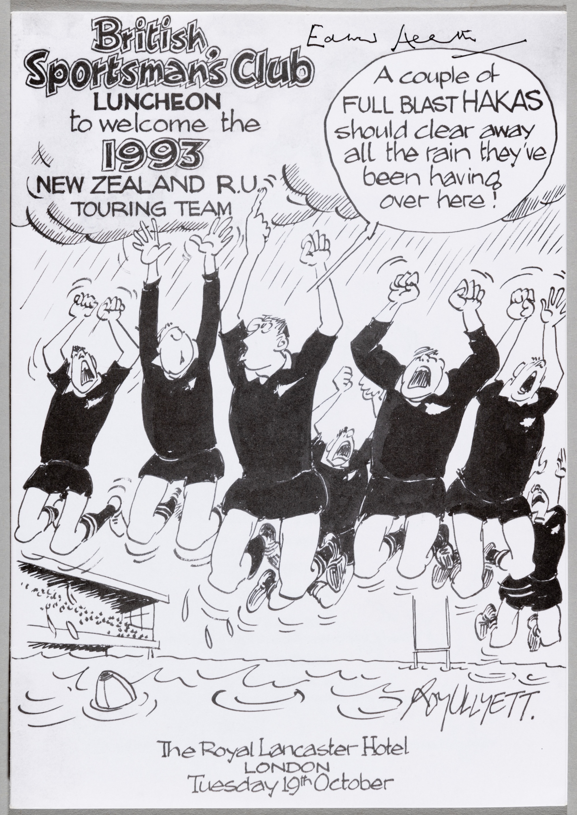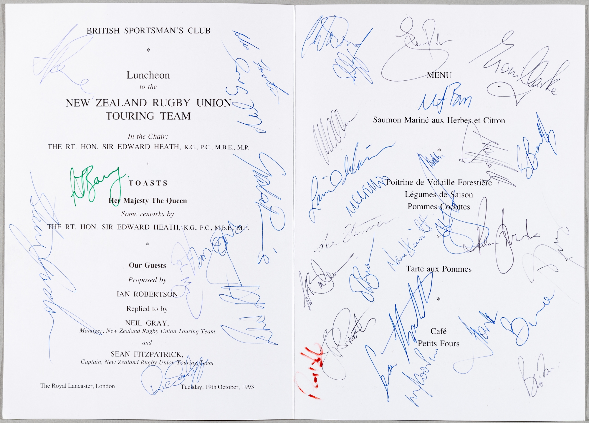 NEW ZEALAND TO U.K. 1993 RUGBY UNION AUTOGRAPHED SPORTSMAN'S CLUB MENU, SUPERB ORIGINAL FOLDOVER BANQUET MENU SIZE 10 BY 7IN. FROM THE LUNCHEON GIVEN BY THE BRITISH SPORTSMANS CLUB TO WELCOME THE 1993 NEW ZEALAND ‘ALL BLACKS’ RUGBY UNION SQUAD TO THE U.K. THE LUNCHEON HELD AT THE ROYAL LANCASTER HOTEL, LONDON, 19TH OCTOBER 1993. DECORATIVE UPPER CARTOON COVER WITH PRINTED DETAILS, BEARING THE ORIGINAL AUTOGRAPH OF FORMER BRITISH PRIME MINISTER EDWARD HEATH TO THE UPPER CLEAR BORDER. BEAUTIFULLY AUTOGRAPHED IN DIFFERENT COLOURED INKS TO THE CENTRE GATEFOLD PAGE BY THE COMPLETE 1993 NEW ZEALAND ‘ALL BLACKS’ SQUAD AND MANAGEMENT, 34 ORIGINAL INK SIGNATURES INCLUDING: SEAN FITZPATRICK (Capt), SHANE HOWARTH, JOHN TIMU, VA’AIGA TUIGAMALA, JEFF WILSON, ERIC RUSH, FRANK BUNCE, MARC ELLIS, STEPHEN BACHOP, MARK ‘BULL’ ALLEN, OLO BROWN, ROBIN BROOKE, ZINZAN BROOKE, BLAIR LARSEN et al. The 1993 New Zealand rugby union tour of Britain was a series of thirteen matches played by the New Zealand national rugby union team (the All Blacks) in England, Scotland and Wales from October to December 1993. Twelve of the matches took place in England or Scotland with only the final match against the Barbarians being played in Wales. New Zealand won twelve of their thirteen games, losing only the international match against England – they won the other international against Scotland
