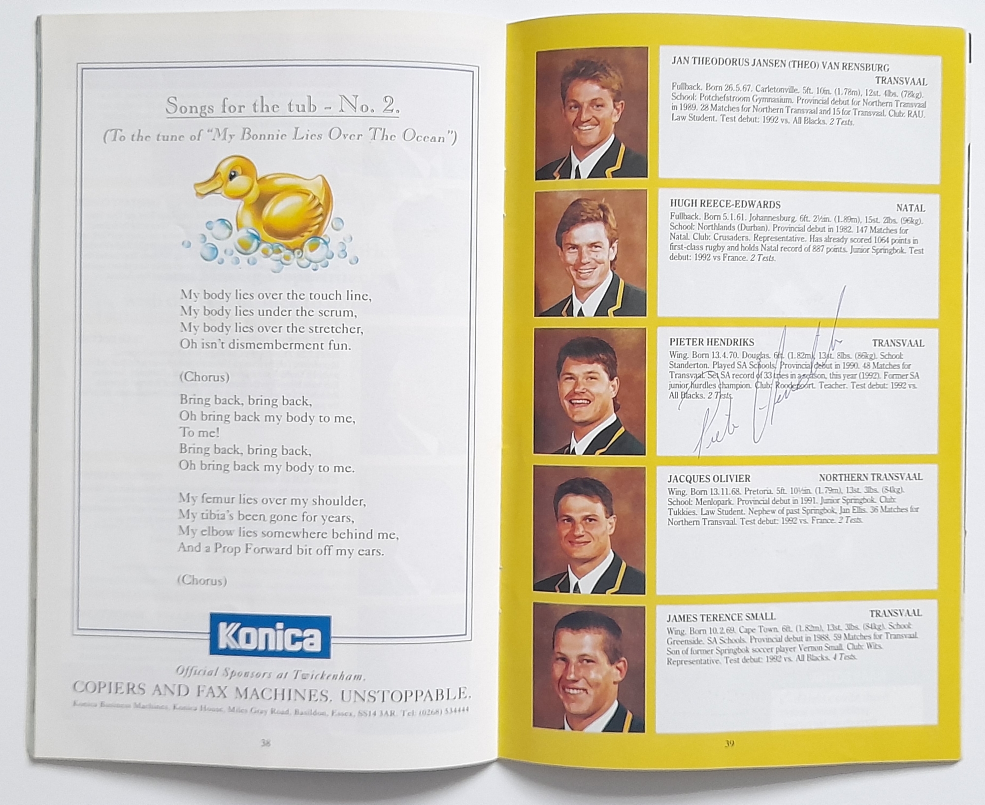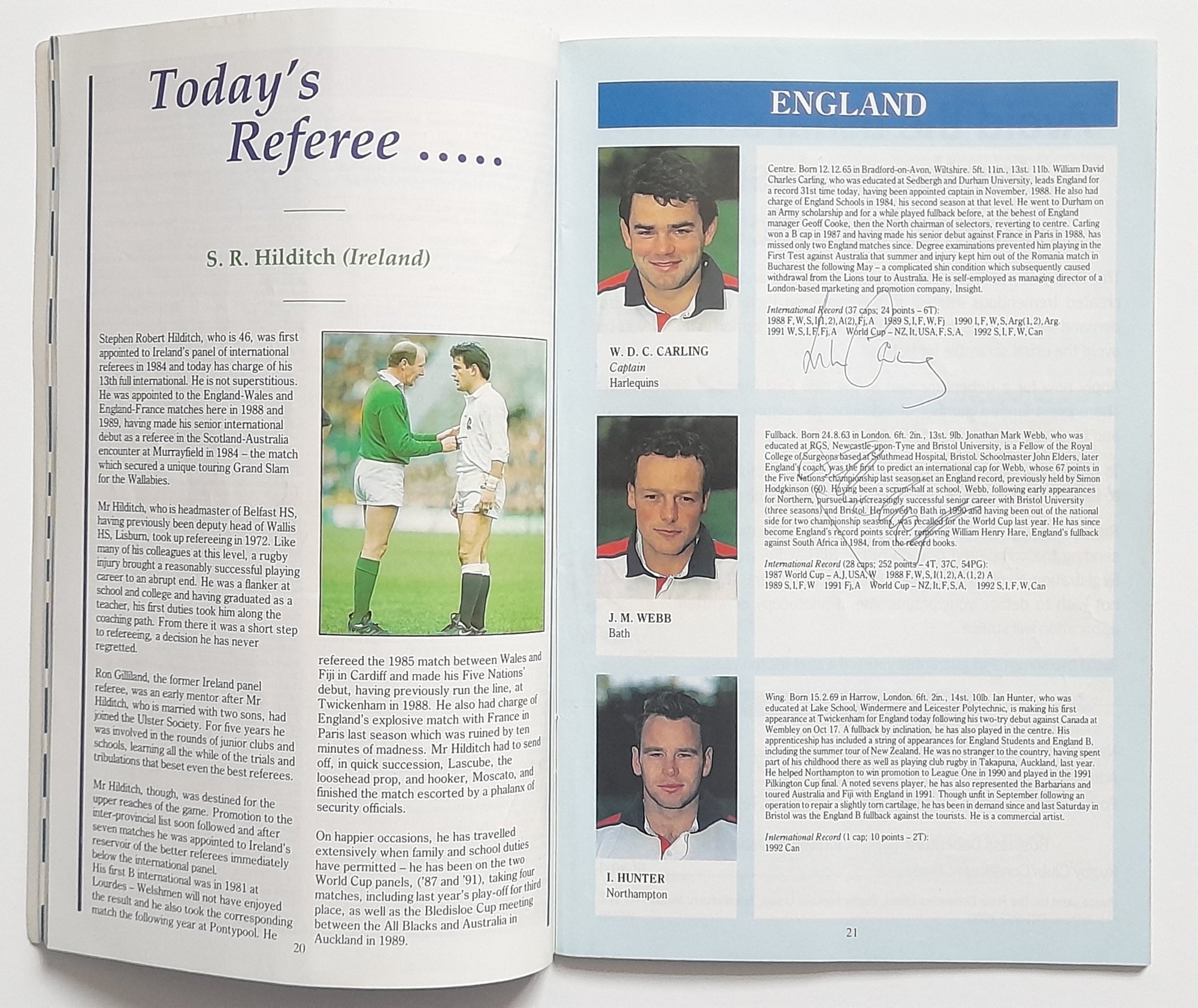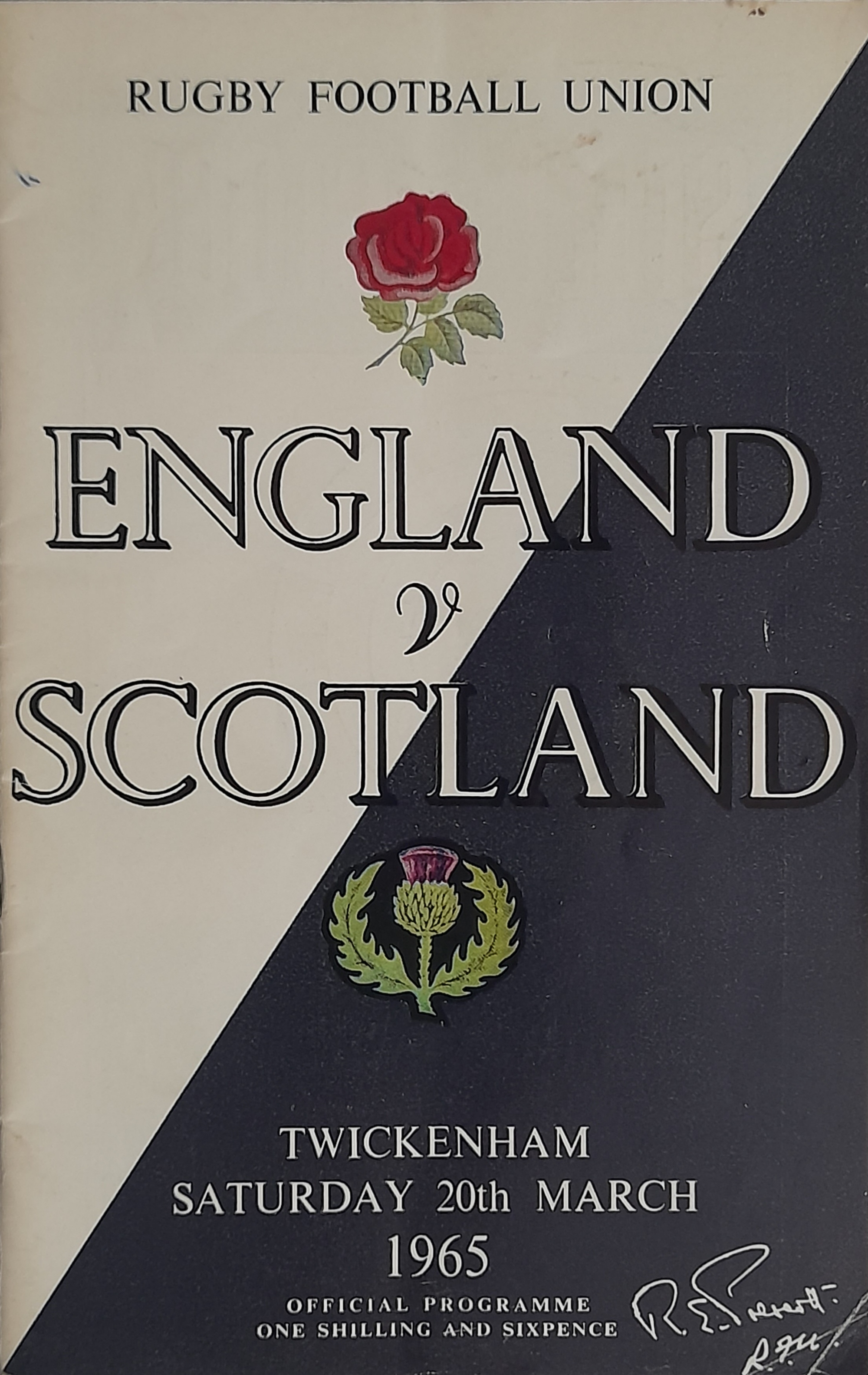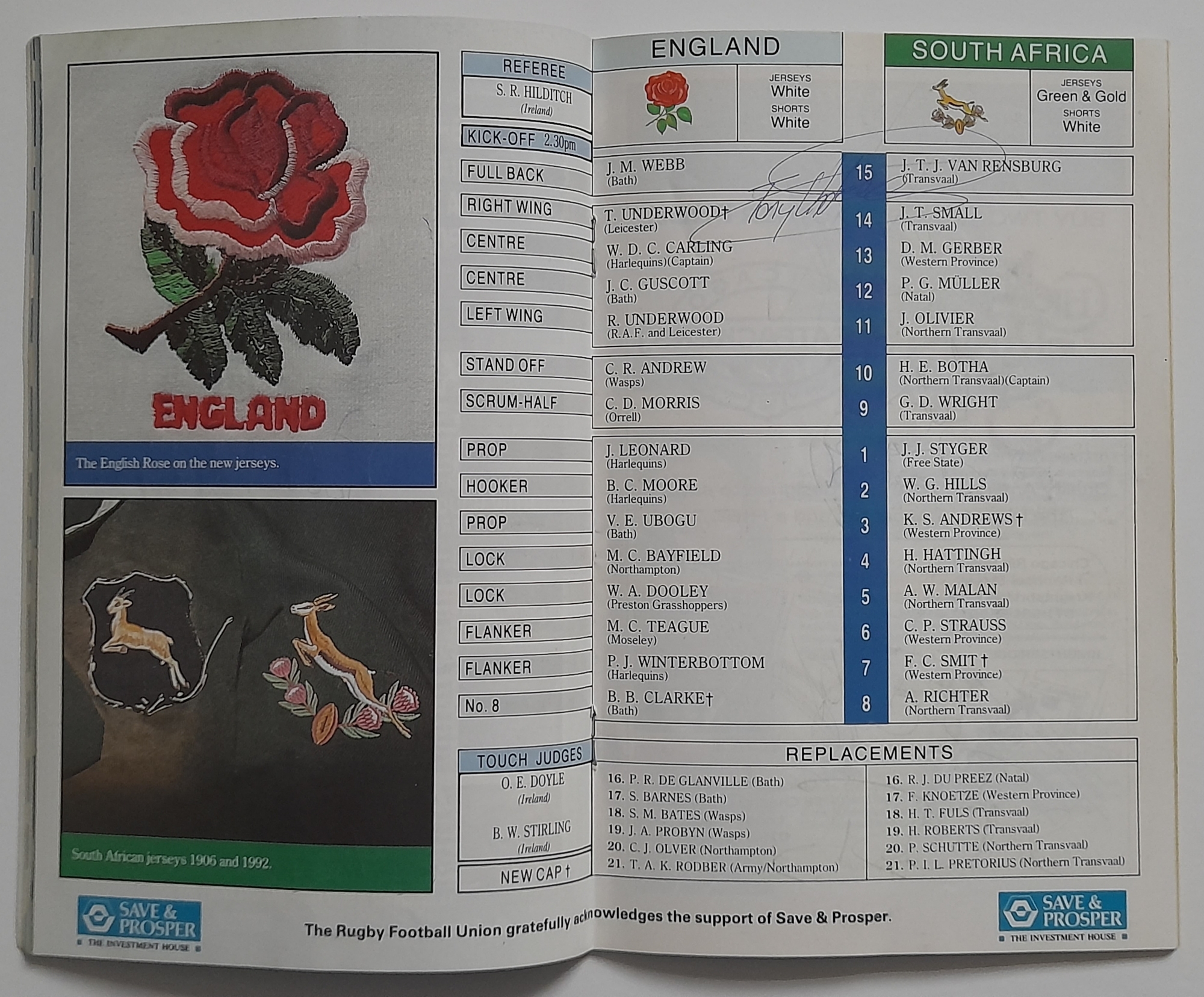Two England signed Rugby Union International programmes, England v Scotland Twickenham 1965 signed by England players, E.L. Rudd, G.P. Frankcom, M.P. Weston, D.G. Perry, D.P. Rogers, C.M. Payne, J.E. Owen, P.E. Rudd, S.B. Richards + 1 along with M.J. Campbell-Lamberton of Scotland. England v South Africa Twickenham 14th November 1992 signed by England players, Will Carling (captain), Jonathan Webb, Jeremy Guscott, Rory Underwood, Rob Andrew, Dewi Morris, Justin Leonard, Brian Moore, Victor Ubogu, Martin Bayfield, Wade Dooley, Michael Teague, Peter Winterbottom, Ben Clarke, Steve Bates, Jeff Probyn, Tim Rodber, Tony Underwood plus from South Africa, Peter Hendriks, Peter Heinrich Rodgers & Ian MacDonald, (2)