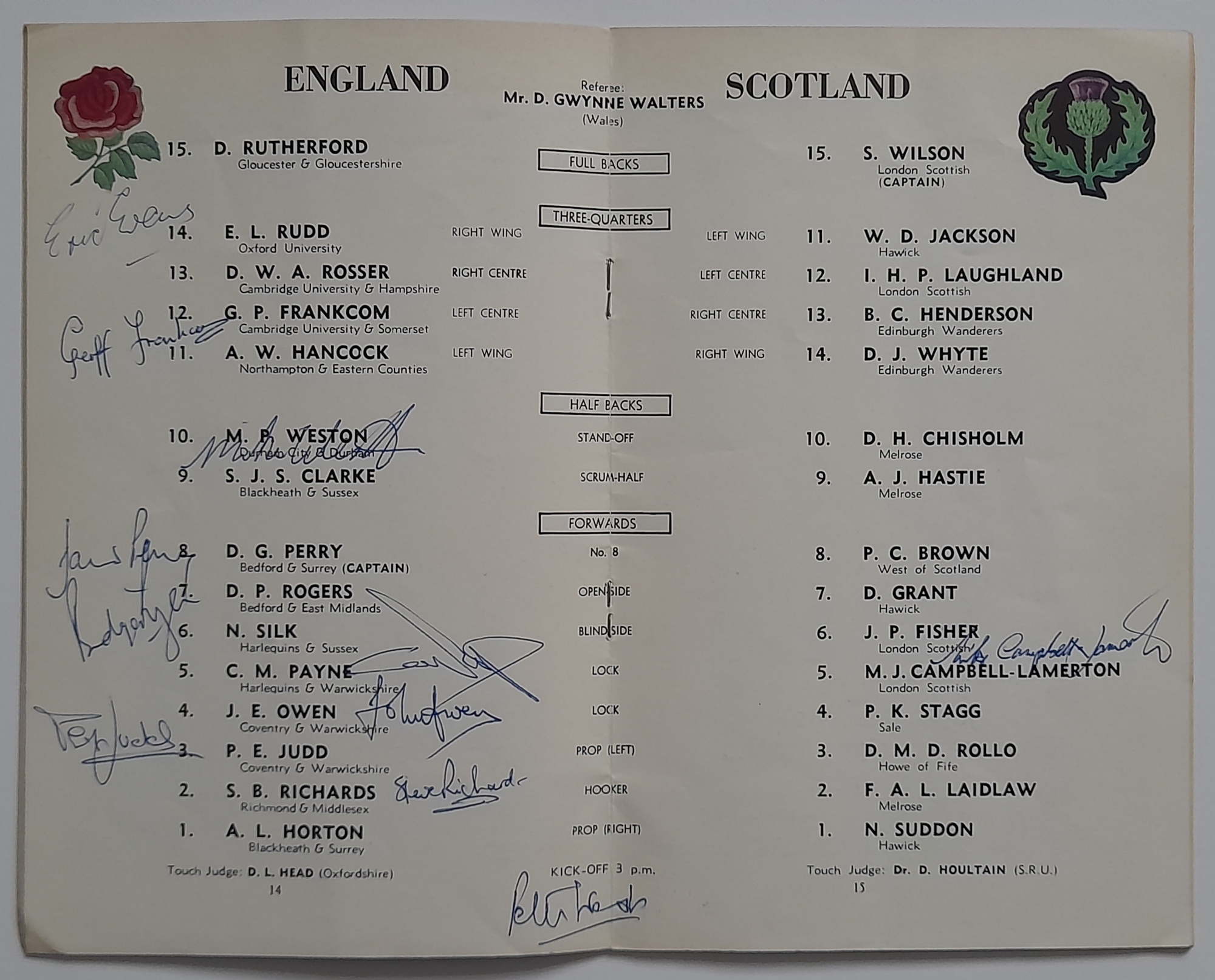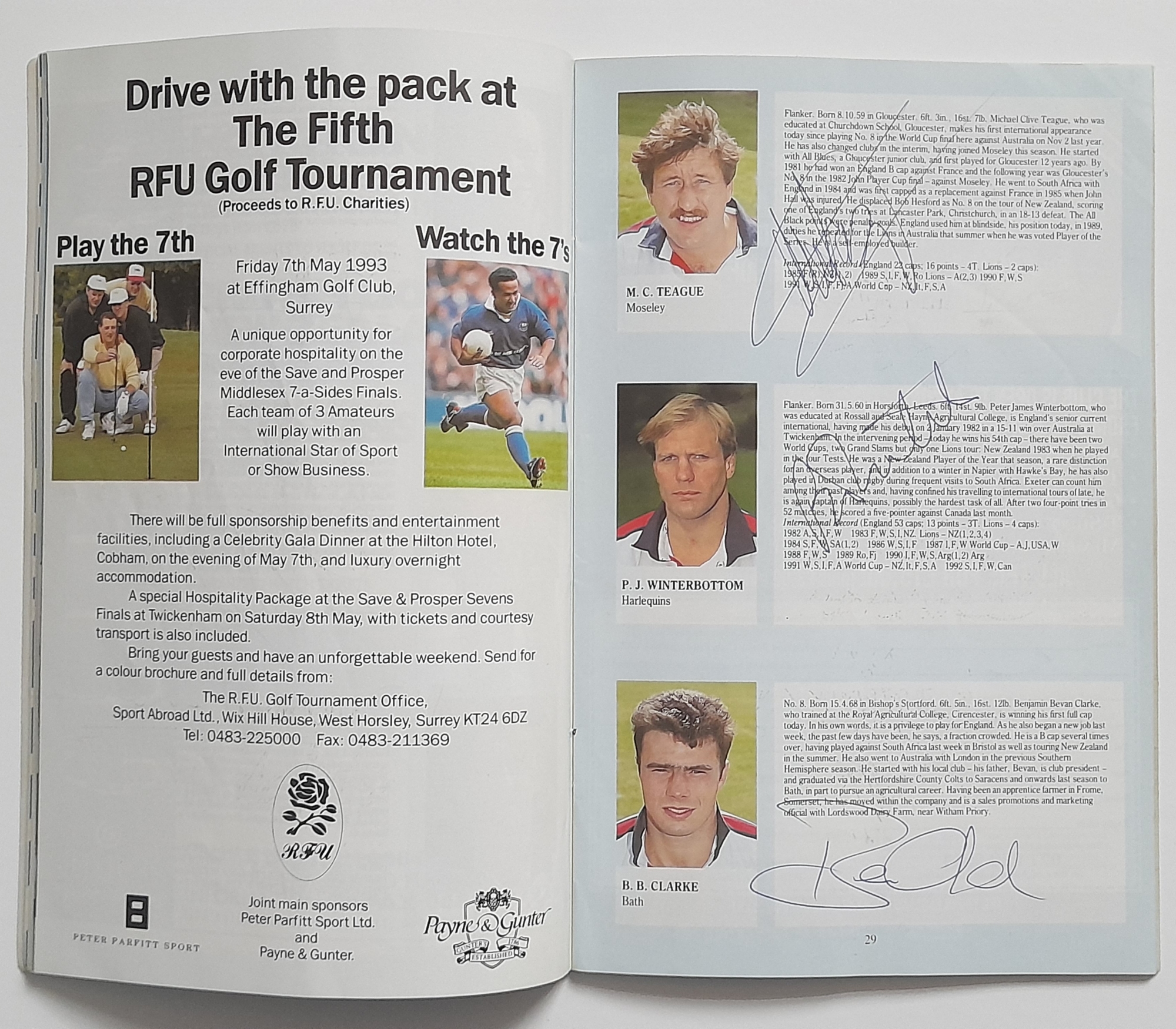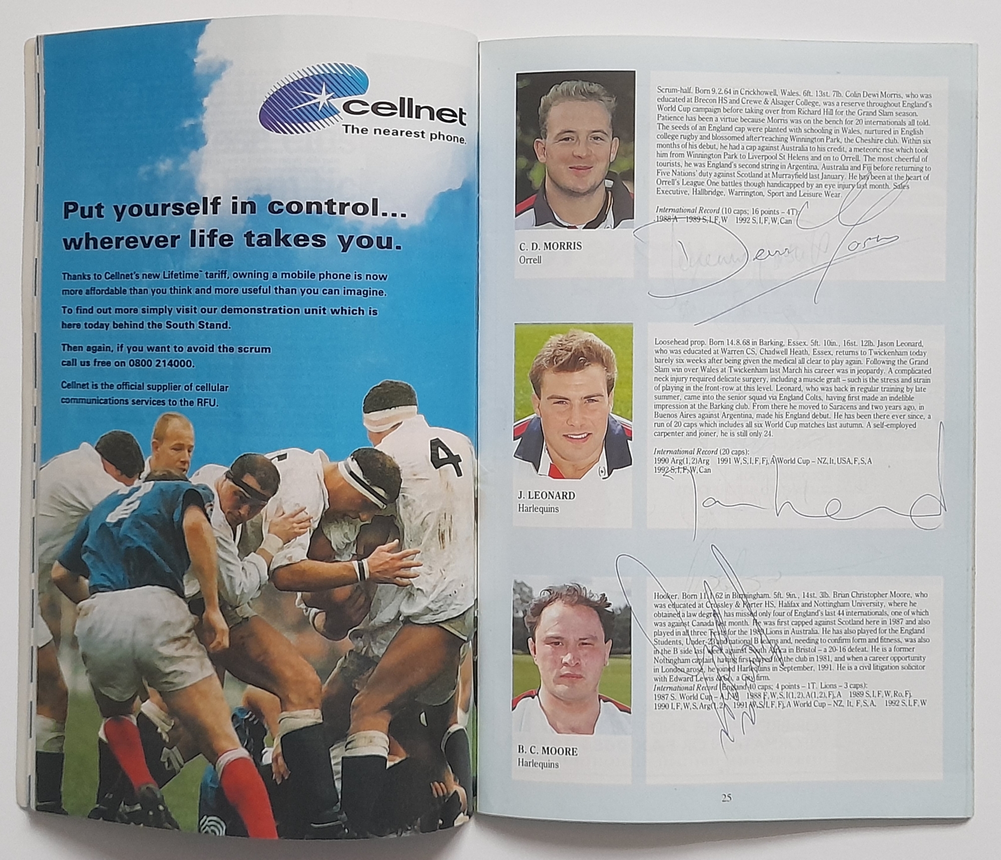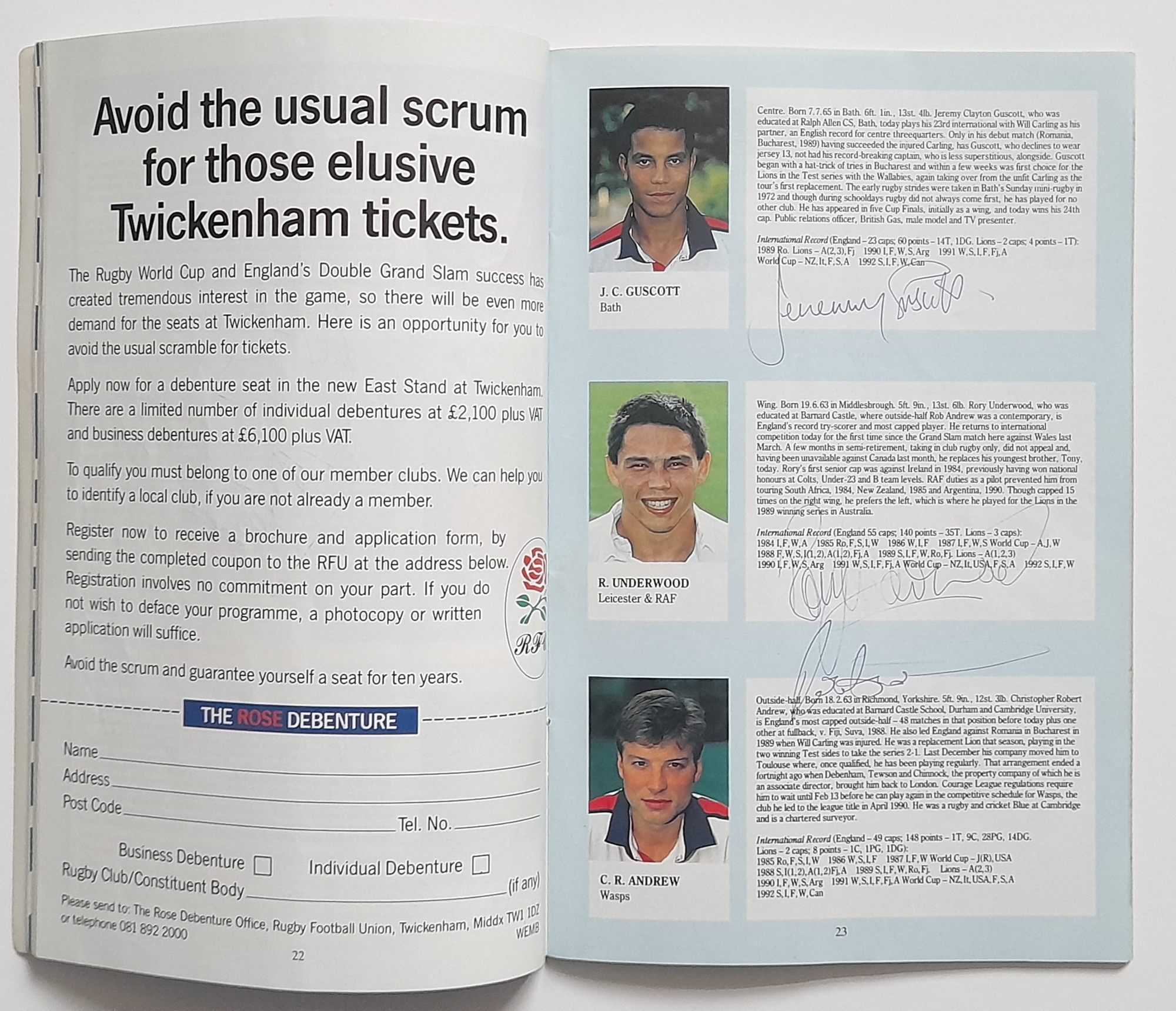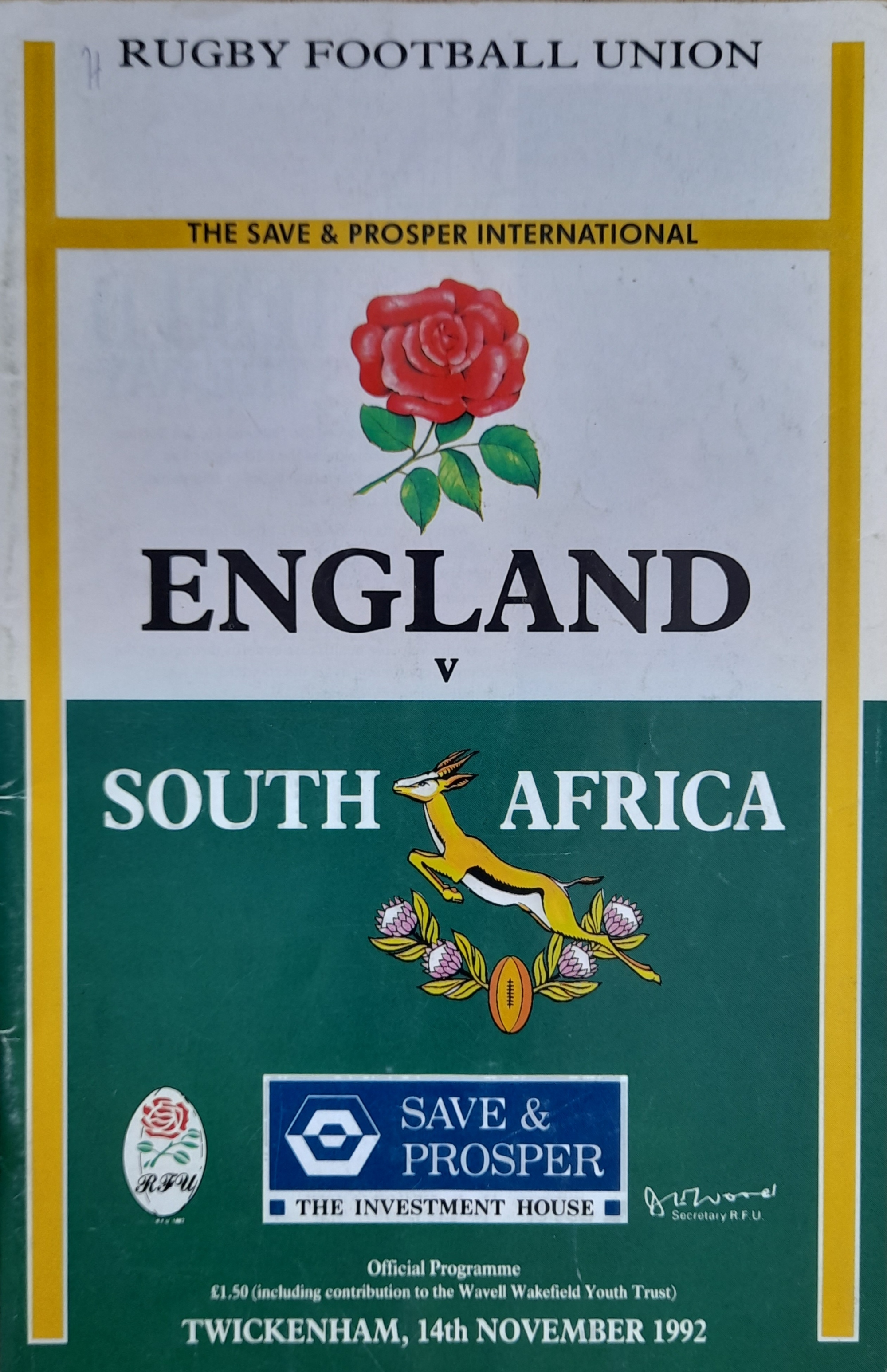 Two England signed Rugby Union International programmes, England v Scotland Twickenham 1965 signed by England players, E.L. Rudd, G.P. Frankcom, M.P. Weston, D.G. Perry, D.P. Rogers, C.M. Payne, J.E. Owen, P.E. Rudd, S.B. Richards + 1 along with M.J. Campbell-Lamberton of Scotland. England v South Africa Twickenham 14th November 1992 signed by England players, Will Carling (captain), Jonathan Webb, Jeremy Guscott, Rory Underwood, Rob Andrew, Dewi Morris, Justin Leonard, Brian Moore, Victor Ubogu, Martin Bayfield, Wade Dooley, Michael Teague, Peter Winterbottom, Ben Clarke, Steve Bates, Jeff Probyn, Tim Rodber, Tony Underwood plus from South Africa, Peter Hendriks, Peter Heinrich Rodgers & Ian MacDonald, (2)