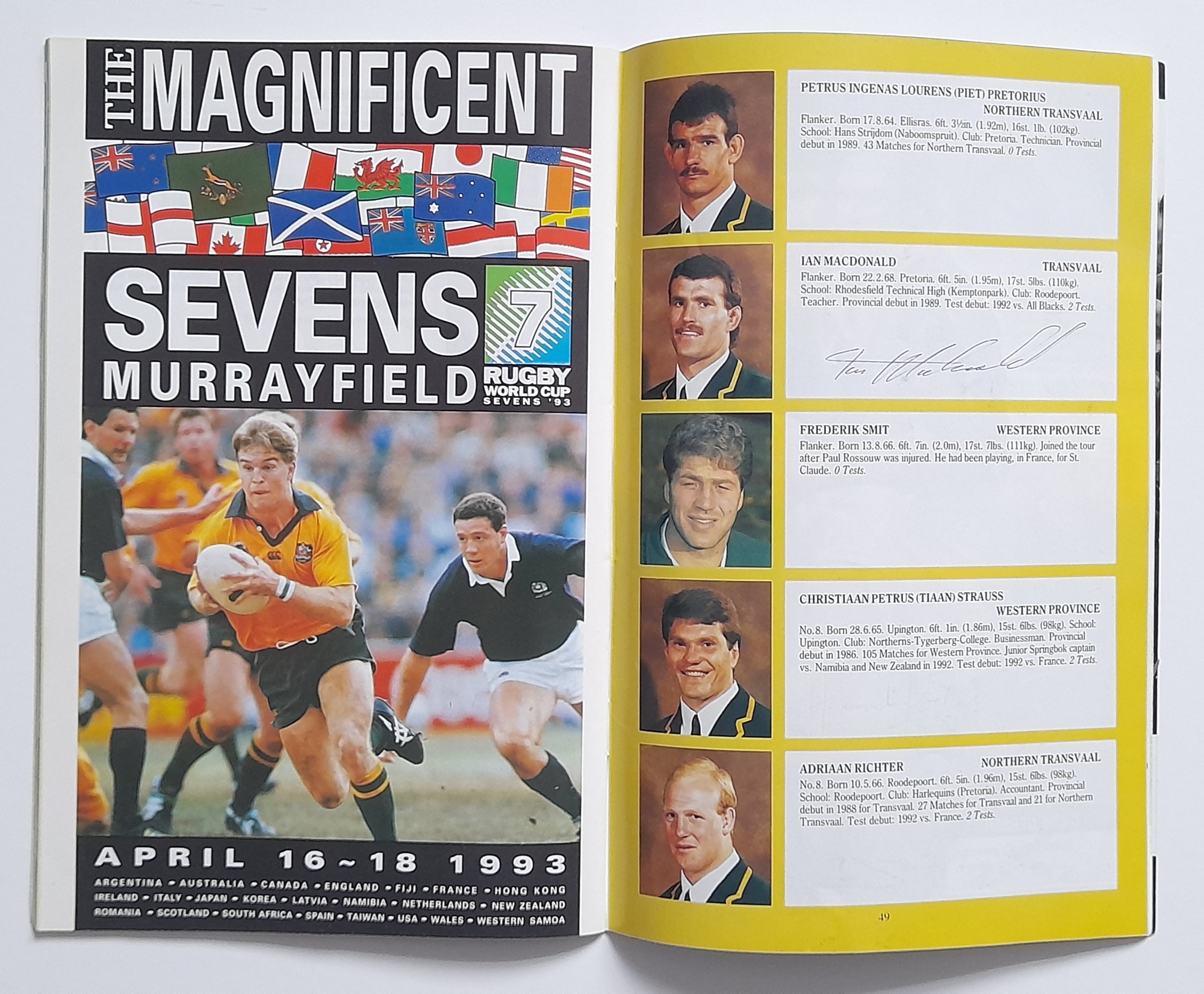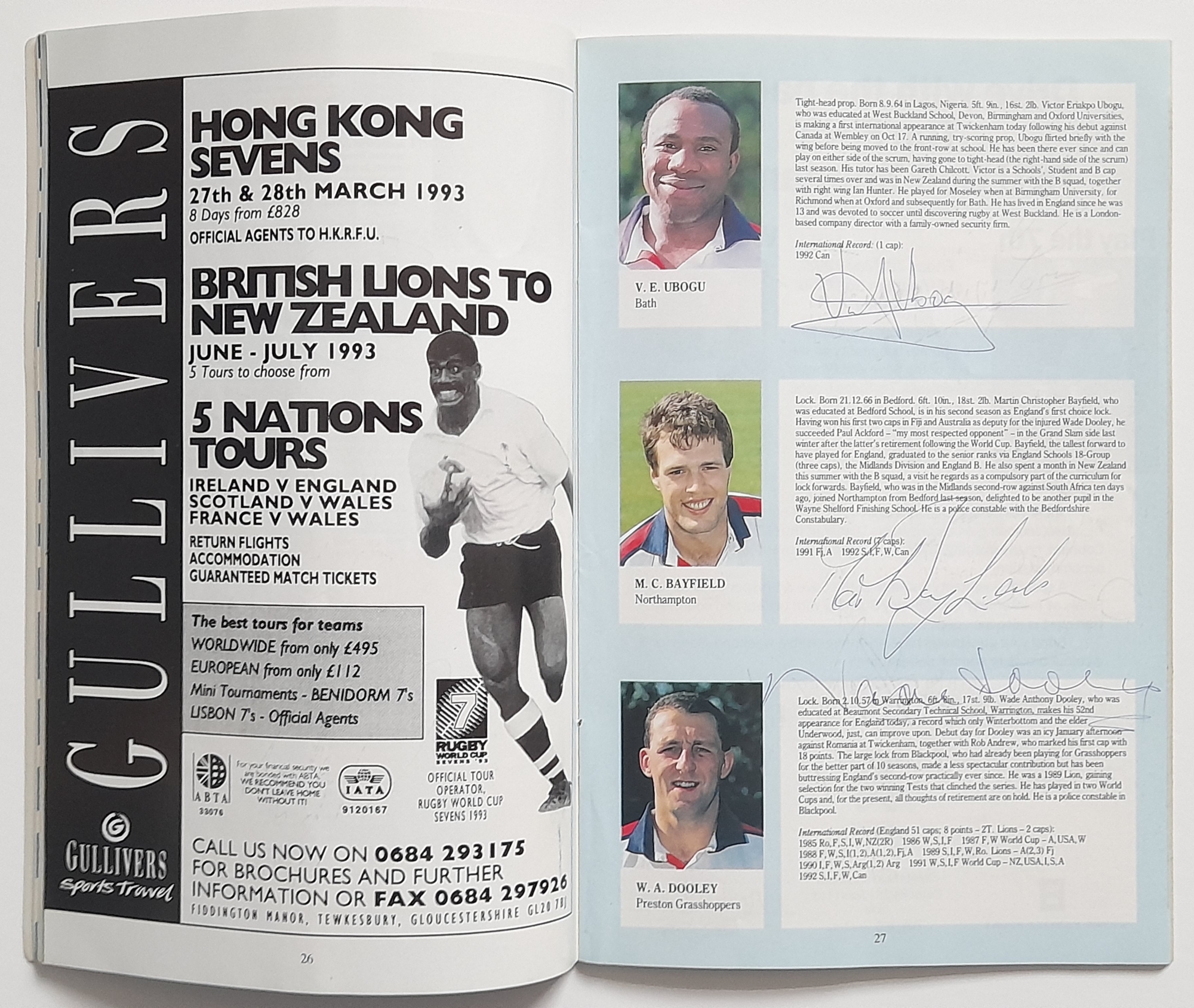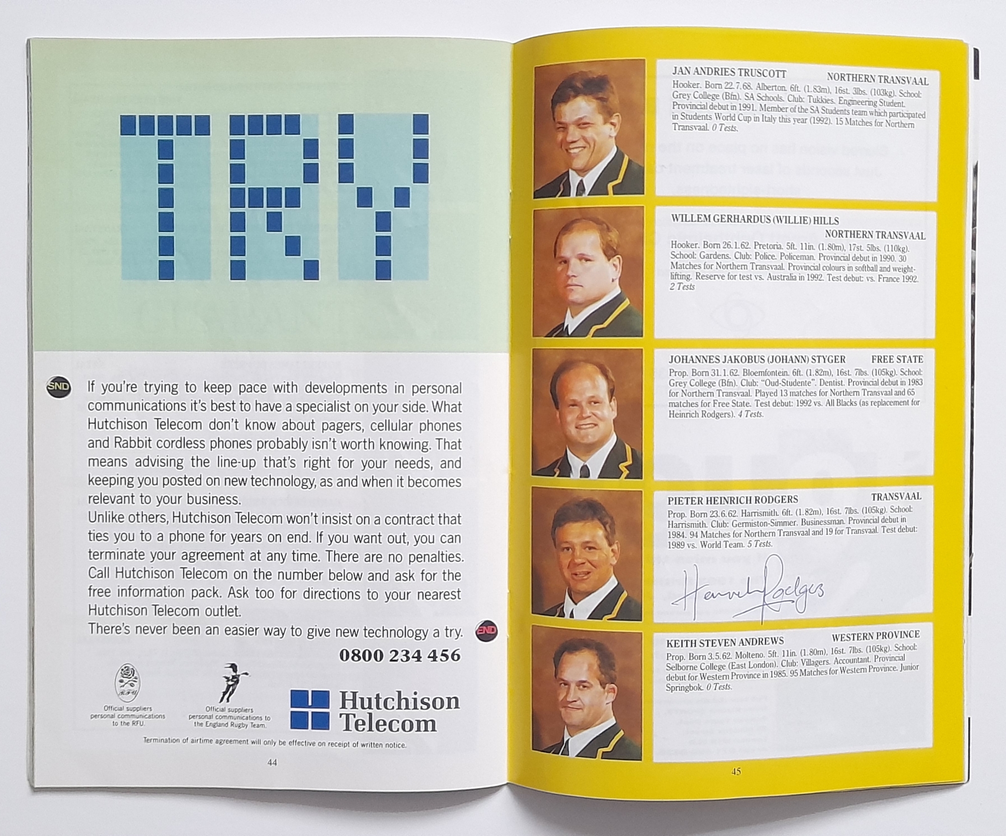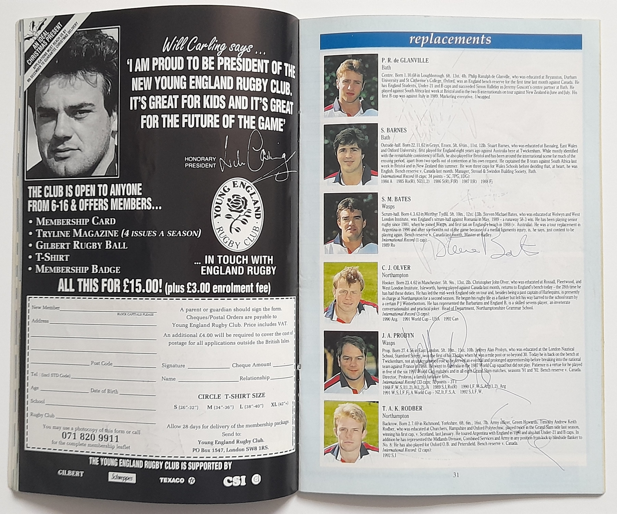 Two England signed Rugby Union International programmes, England v Scotland Twickenham 1965 signed by England players, E.L. Rudd, G.P. Frankcom, M.P. Weston, D.G. Perry, D.P. Rogers, C.M. Payne, J.E. Owen, P.E. Rudd, S.B. Richards + 1 along with M.J. Campbell-Lamberton of Scotland. England v South Africa Twickenham 14th November 1992 signed by England players, Will Carling (captain), Jonathan Webb, Jeremy Guscott, Rory Underwood, Rob Andrew, Dewi Morris, Justin Leonard, Brian Moore, Victor Ubogu, Martin Bayfield, Wade Dooley, Michael Teague, Peter Winterbottom, Ben Clarke, Steve Bates, Jeff Probyn, Tim Rodber, Tony Underwood plus from South Africa, Peter Hendriks, Peter Heinrich Rodgers & Ian MacDonald, (2)