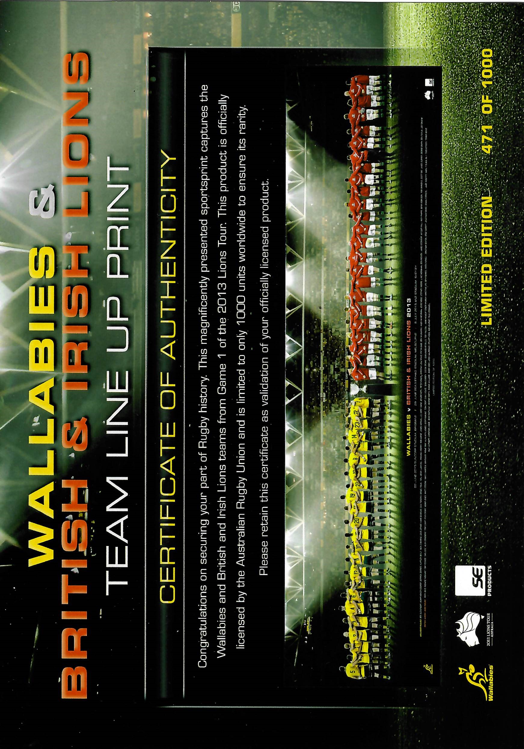 British & Irish Lions 2013 Tour of Australia, Limited Edition print 471 of 1000, official panoramic lithograph from Game 1 of the series. Size 100 by 25cm. Officially licensed by Australian Wallabies and British Irish Lions. The British & Irish Lions won the series 2-1. Comes with official Limited Edition COA. (2 items)