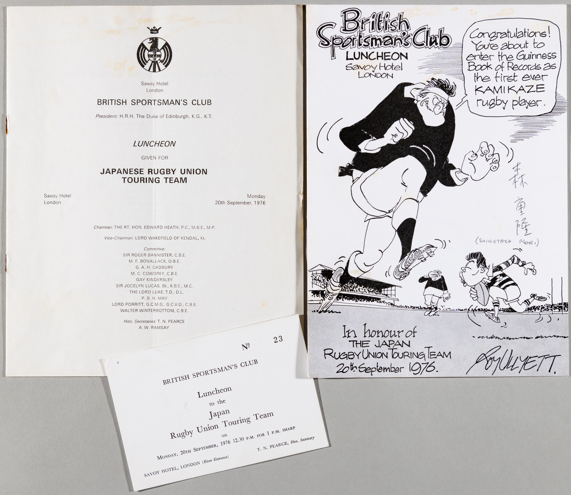 JAPAN RUGBY UNION TOURISTS TO THE UK 1976 WELCOME DINNER MENU, SEATING PLAN & INVITATION ORIGINAL BRITISH SPORTSMAN’S CLUB MENU, SEATING PLAN & INVITATION FOR THE CELEBRATION DINNER TO WELCOME THE 1976 JAPANESE RUGBY UNION TOURING TEAM TO THE UK, HELD AT THE SAVOY HOTEL, LONDON, 20TH SEPTEMBER, 1976. DECORATIVE ROY ULLYETT CARTOON TO THE FRONT COVER WITH FURTHER PRINTED DETAILS TO THE INNER PAGES AND BACK COVER. THE MENU SIGNED IN JAPANESE BY THE JAPANESE CENTRE SHIGETAKA MORI. THE FOUR PAGE SEATING PLAN HAS A VERTICAL FORMER FOLD MARK AND THE INVITATION HAS WRITING TO THE BACK COVER WHICH LOOKS LIKE POSSIBLE SPEECH NOTES. ALL THREE ITEMS IN GOOD CONDITION The 1976 Japan rugby union tour of Europe was a series of ten matches played by the Japan national rugby union team in the United Kingdom and Italy in September and October 1976. Japan won three and lost seven of their ten matches. They lost all three of the matches against international representative teams; a Scottish XV, England under-23 and Italy.