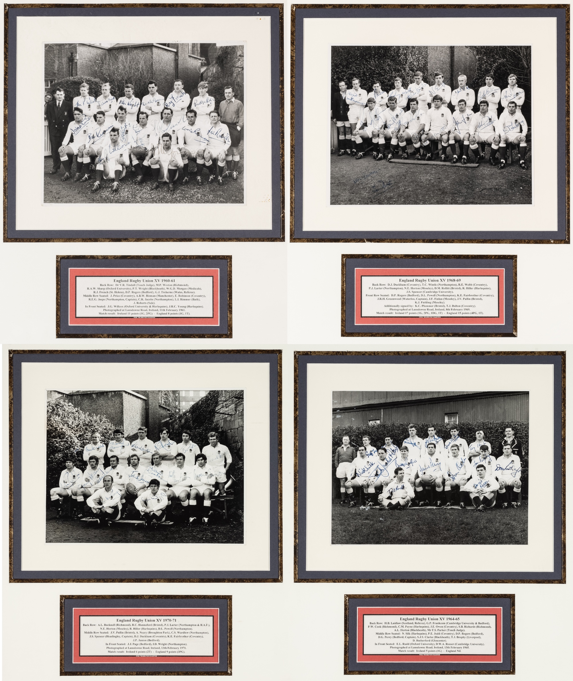 Four signed official England rugby union team-group photographs, dating from the 1960s and 1970s, comprising 1960-61 team with touch judge Dr VR Tindall and Welsh referee GJ Treherne taken prior to fixture v Ireland at Lansdowne Road, 11th February 1961, the signed 19 by 24cm. photograph mounted above type legend; 1964-65 team with Scottish referee HB Laidlaw and touch judge FS Parker taken prior to fixture v Ireland at Lansdowne Road, 13th February 1965, the signed 19 by 24cm. photograph above typed legend; 1968-69 team taken prior to fixture v Ireland at Lansdowne Road, 8th February 1969, the signed 19 by 24cm. photograph above typed legend; 1970-71 team taken prior to fixture v Ireland at Lansdowne, 13th February 1971, the signed 19 by 24cm., each glazed and framed, overall 52 by 46cm., (4) Ireland defeated England 11-8, 11th February 1961. Ireland defeated England 5-0, 13th February 1965. Ireland defeated England 17-15, 8th February 1969. England defeated Ireland 9-6, 13th February 1971. Please be aware all glass will be removed from framed items prior to posting and may result in delays shipping your items. (This service is included in the cost of postage and packing). Alternatively lots can be collected in person by prior appointment from NN8 1RT.
