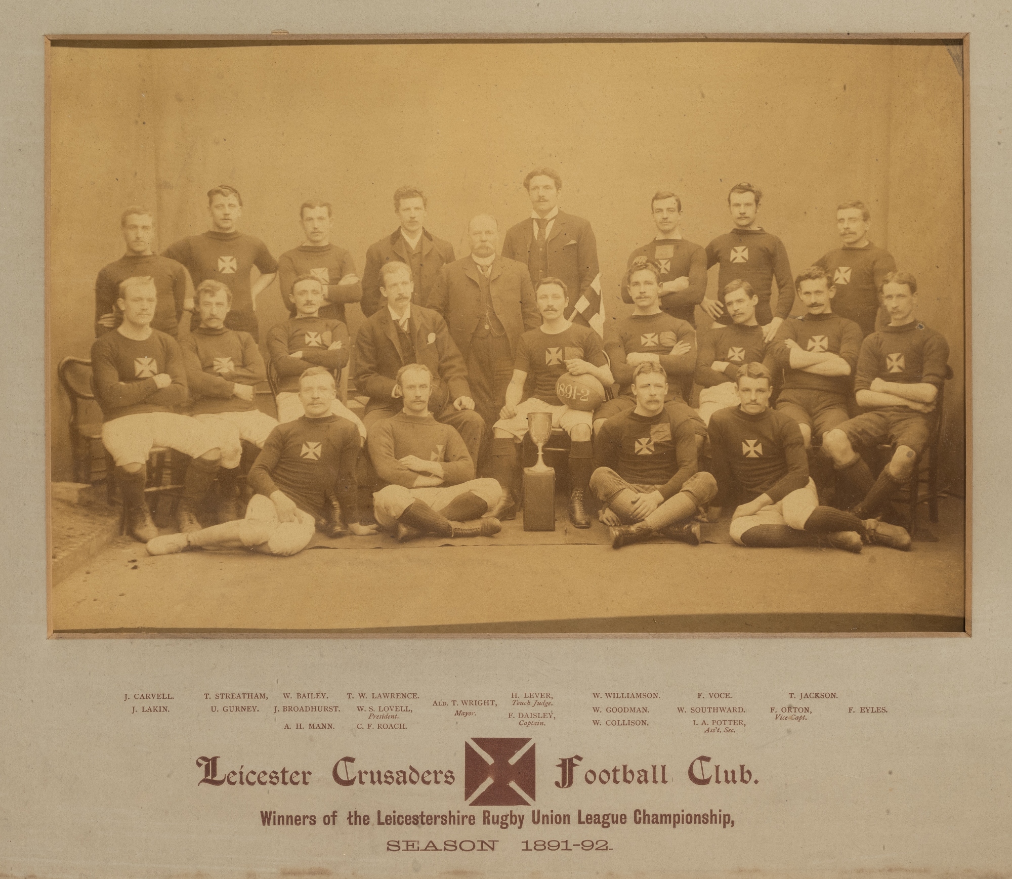 Pair of early b&w photographs of Leicester Crusaders RFC team, season 1891-92, the first a team photograph of players and officials with trophy cup,