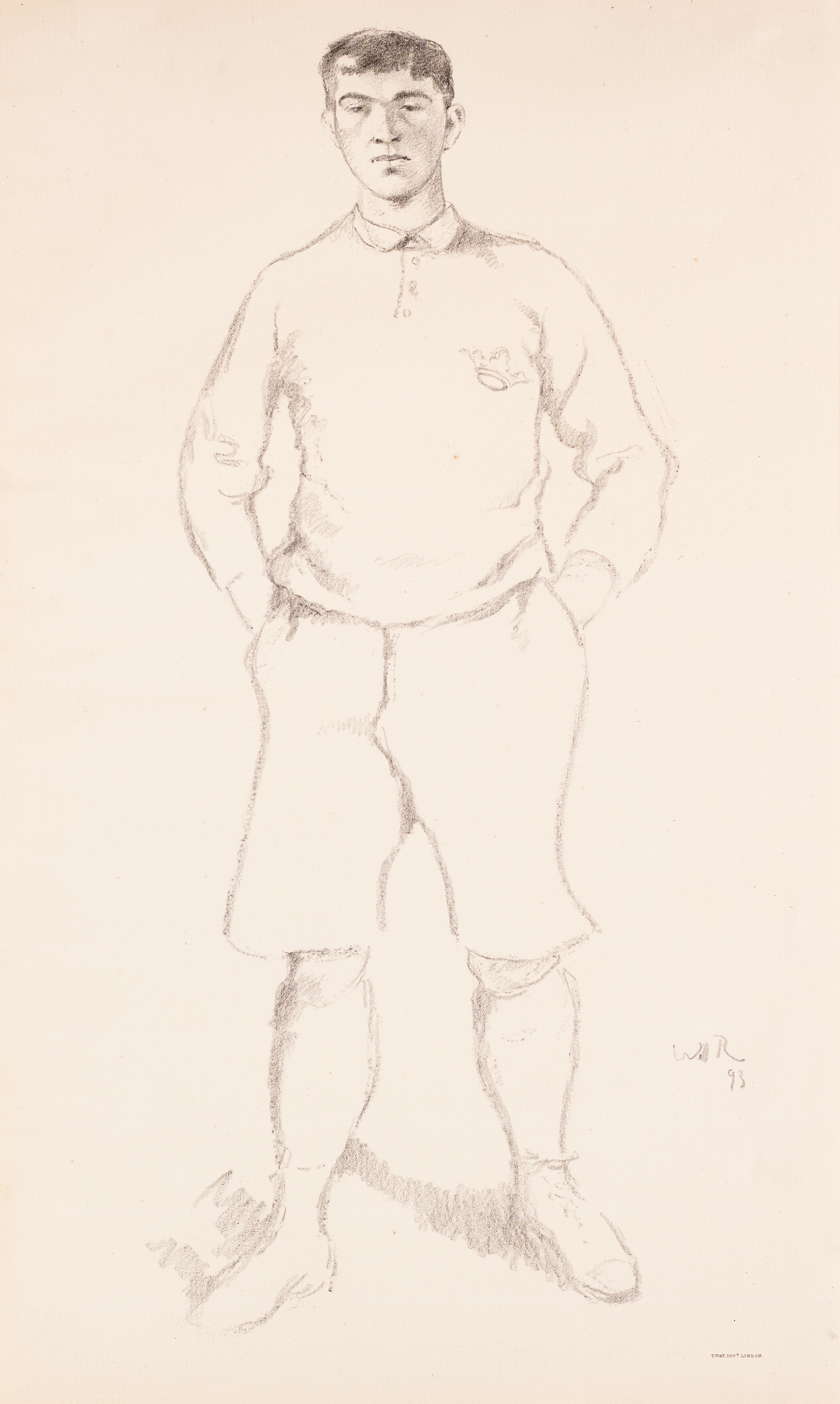 William Rothenstein (British, 1872-1945) 'J Conway Rees' lithograph during his time at Oxford University, featuring the rugby player in standing pose with his hands in his pockets, bears pencil artist initials and '93, framed, overall 61 by 43cm. J Conway Reed was captain of Oxford University and later a Wales international. Please be aware all glass will be removed from framed and glazed items prior to posting and may result in delays to shipping your items. (This service is included in the cost of postage and packing). We can also totally remove all framing and mounts upon request to reduce shipping costs. Alternatively lots can be collected in person by prior appointment from NN8 1RT.