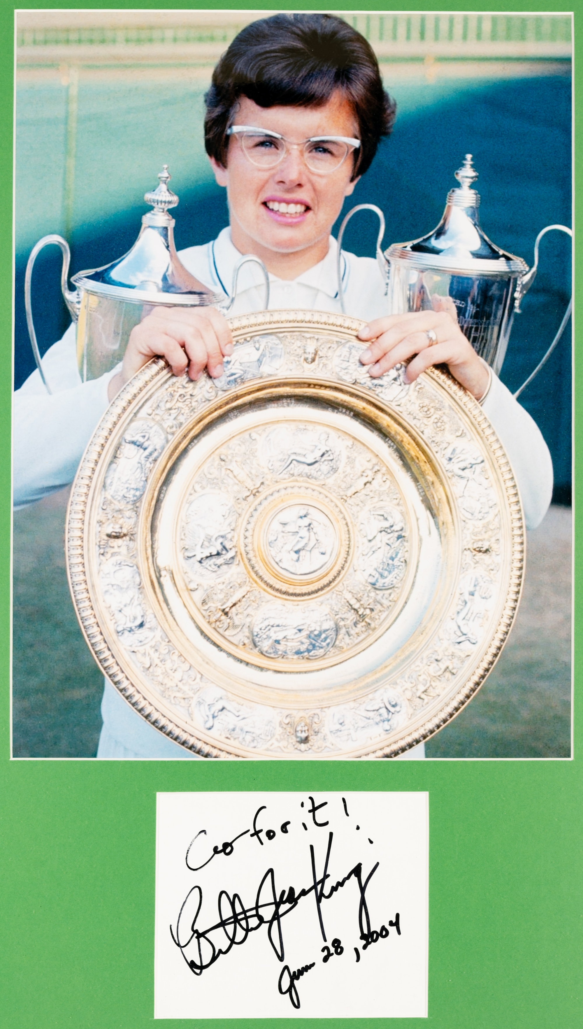 Billy Jean King signed photographic display, featuring the Women's Wimbledon Venus Rosewater Dish trophy, mounted above her autograph in black marker, glazed and framed, overall 64 by 43cm. Please be aware all glass will be removed from framed and glazed items prior to posting and may result in delays to shipping your items. (This service is included in the cost of postage and packing). We can also totally remove all framing and mounts upon request to reduce shipping costs. Alternatively lots can be collected in person by prior appointment from NN8 1RT.