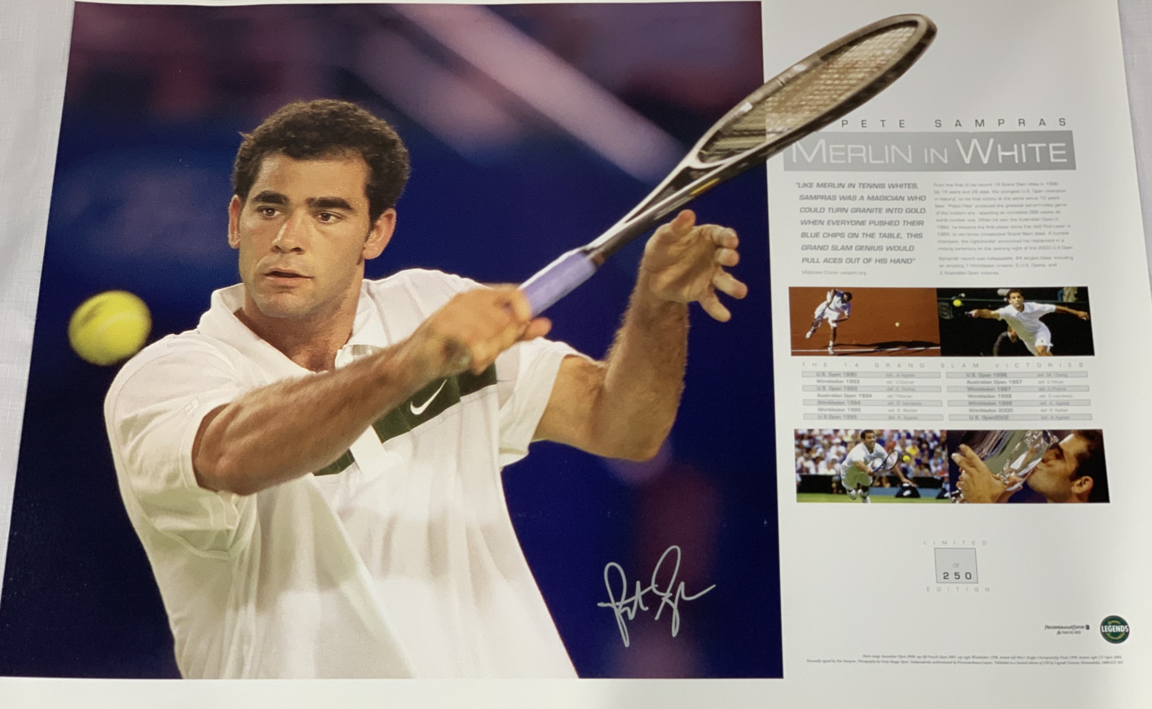 Pete Sampras (USA) signed limited edition tennis print “Pete Sampras, Merlin in White”, Limited edition of 250.Official licensed product, produced by
