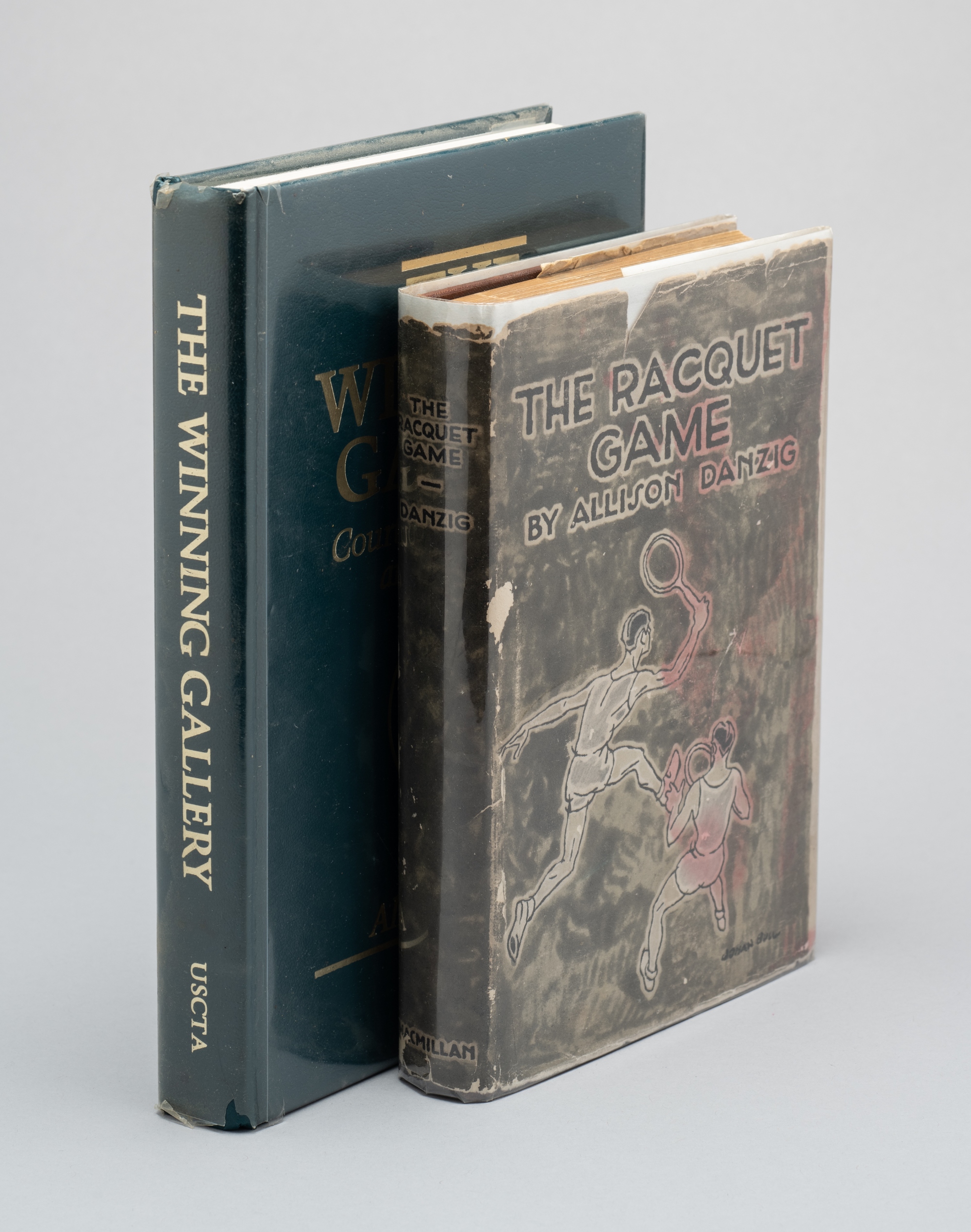 Two real tennis books by Allison Danzig, i) The Racquet Games, 1930, in rare but chipped dust wrappers, contains parts on court tennis, racquets and squash; ii) The Winning Gallery, Court Tennis Matches and Memories, 1985, each bearing wear, (2)