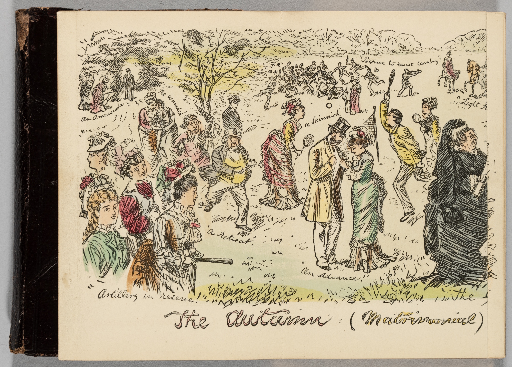 Punch's Pocket Book 1877, with a coloured fold-out illustration of a mixed doubles tennis game, also with an unusual engraving facing p.63 containing