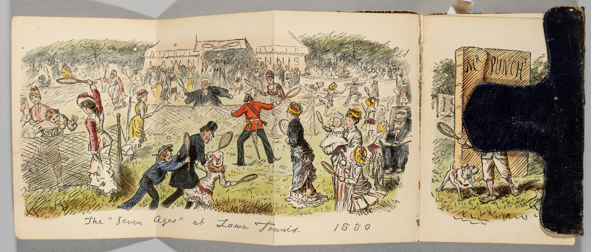 Punch's Pocket Book 1880, with a coloured fold-out illustration frontispiece devoted to lawn tennis, in addition an engraving facing p.60 with a coup