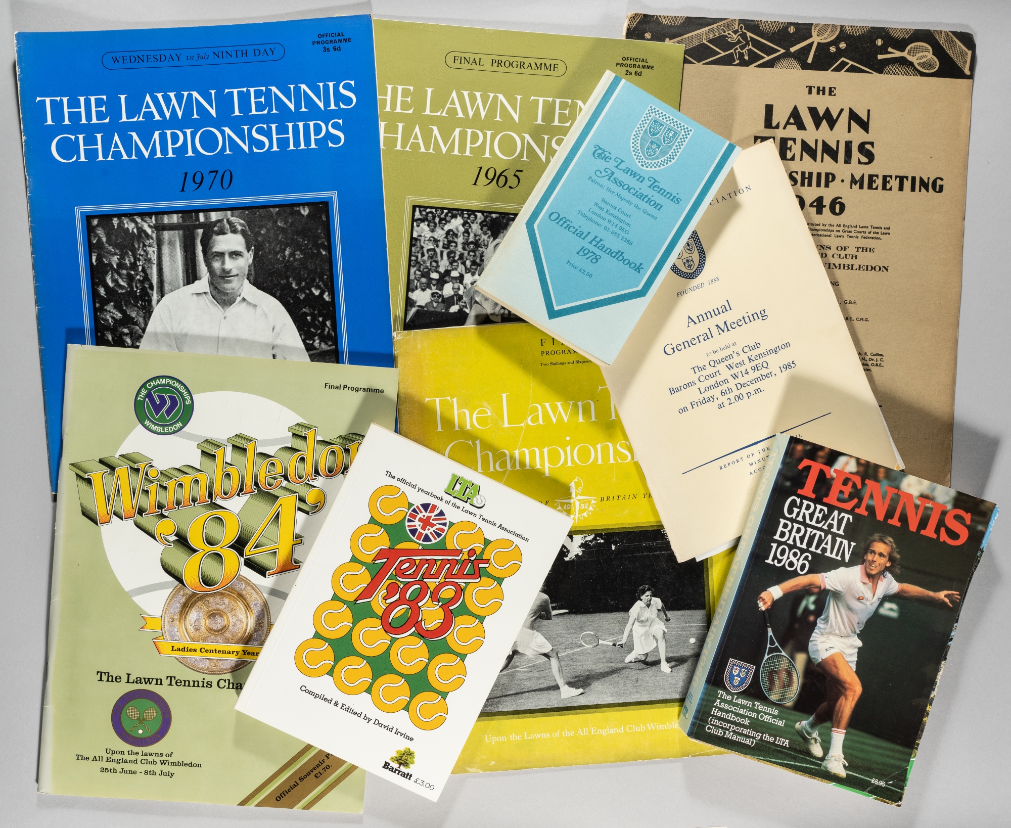 Collection of Wimbledon tennis programmes, dating from 1946 to 2018, not complete run, 1946 final; 1947 final; 1948 final; 1949 final 2nd July; 1950 final 8th July; 1951 Festival of Britain final; 1952 final; 1953 final; 1962 final; 1963 final; 1964 final; 1965 final (2); 1966 final (3); 1967 final (2); 1968 final; 1969 final; 1970 1st July; 1971 final; 1972 final; 1973 final; 1974 final; 1975 final; 1976 final; 1977 20th, 21st, 25th, 29th & 30th June, 1st & 2nd July; 1980 23rd June; 1981 3rd & 4th (2) July; 1982 4th July & final; 1983 final (2); 1983 final; 1984 final; 1985 final; 1986 28th June & final; 1987 22nd (2) & 29th June; 1988 29th June; 1990 29th June; 1991 24th June; 1992 22nd June; 1997 26th (2) & 27th June; 1998 26th June & 3rd July; 1999 22nd & 23rd June; 2000 30th June; 2002 4th July; 2003 6th July; 2007 26th June; 2009 25th June; 2010 21st & 30th June, 1st July; 201125th June; 2012 26th June, 2nd July; 2015 7th July; 2016 3rd July; 2018 4th July; majority in good condition, some early programmes bearing bear to covers and spines; sold together with a collection of tennis related hand and yearbooks, comprising LTA yearbook 1980, 1982 & 1983; Tennis Great Britain 1985 & 1986; LTA handbook 1978, 1979 (2), 1982 & 1983; ITF Rules of Tennis 1979 (2), 1980 (2); Rules & Standing Orders of the International Tennis Federation 1979 & 1980; Regulations for the International Tennis Championship (Davis Cup) 1978 & 1979; Lawn Tennis a talk on Umpiring by Sir Leonard Vavsour; LTA Annual General Meeting 1978 (12), 1979 (17), 1980 (6), 1981, 1982, 1983 & 1985; (qty)
