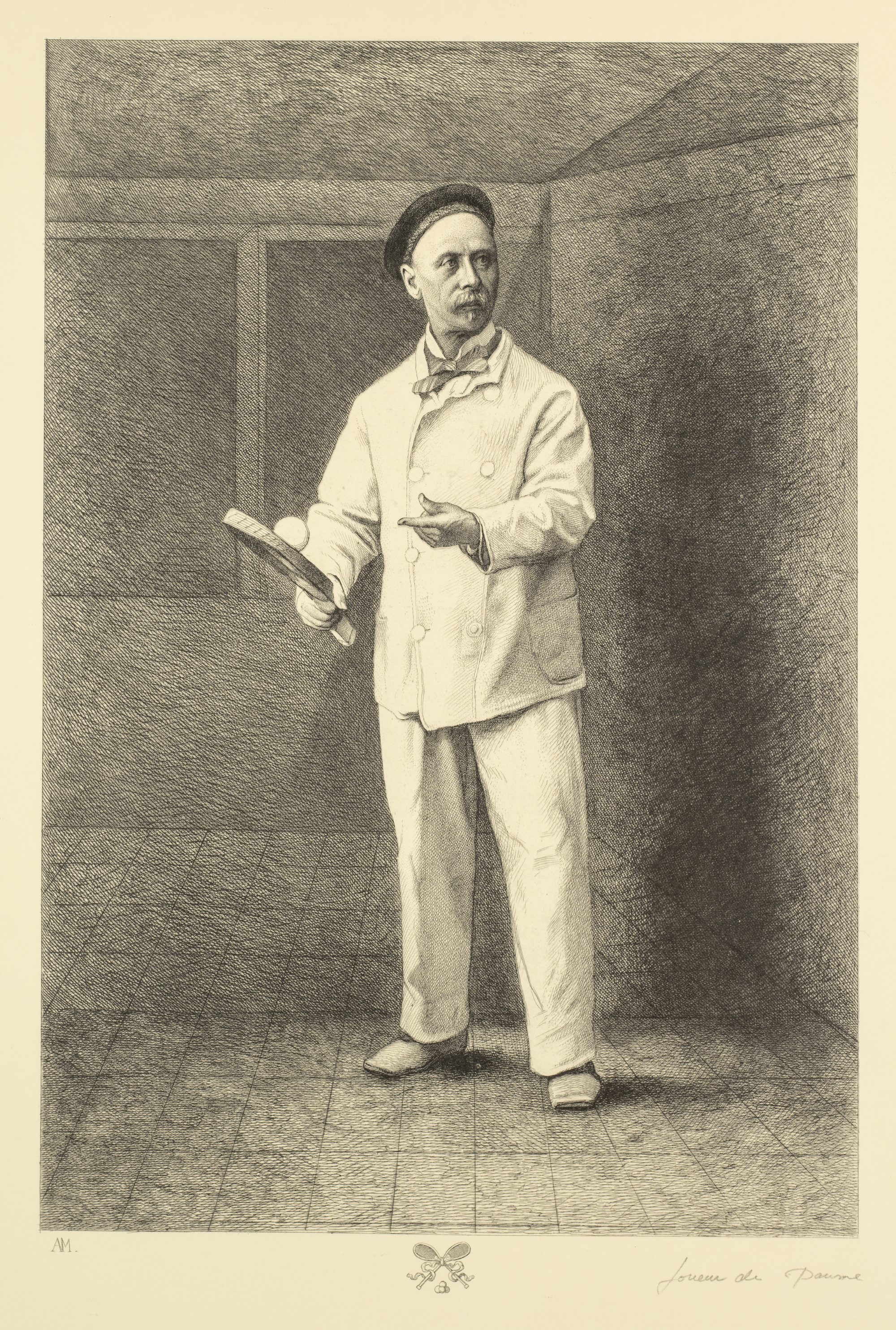 A print and three books of real tennis interest, engraved portrait of the player Charles Delahaye known as "Biboche", signed AM in the plate, inscrib