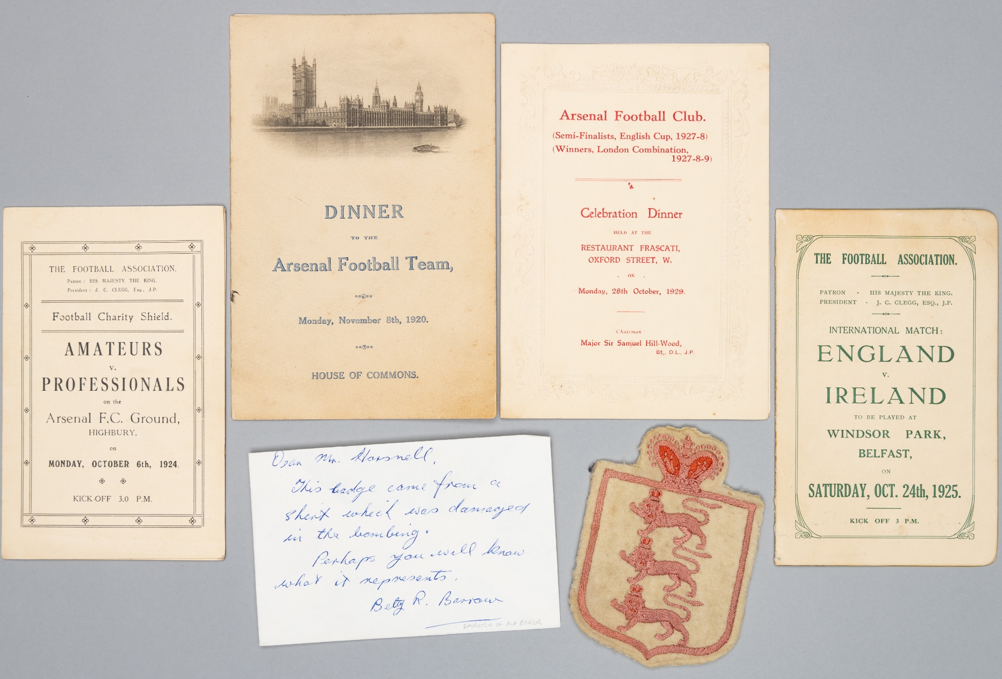 A group of memorabilia originally owned by Alf Baker of Arsenal FC, comprising an England shirt badge with three lions and crown in rose coloured silk, accompanied by a hand written note from Alf Baker's daughter confirming the badge came from one of her father's shirts which was damaged in the bombing in the WWII; a House of Commons dinner menu to the Arsenal football team, 8th November 1920, signed by guests profusely to the back cover in pencil and ink, with further signatures inside, McKinnon, Rogers, Fennell, Travis, Seddon, Hall, Hutchins, Jones, Oliver, King, Knighton, Ashton, Groves, and others, minor wear and corner creases, also with complete invitation to Alf Baker; a further menu, unsigned for Arsenal's celebration of London Combination Winners and English Cup semi-finalists, 1927-8-9; and two FA itineraries, the first for the 1924 Charity Shield at Highbury Amateurs v Professionals, the second England International v Ireland played in Belfast, 24th October 1925, (7)