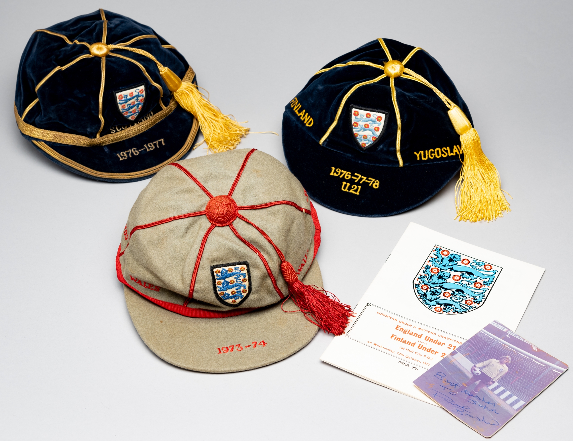 A group of three representative caps awarded to Paul Bradshaw, comprising a England cap for the UEFA Youth championship, season 1973-74, inscribed Wales (2) and Netherlands (2); and England U-21 cap dated 1976-77-78, inscribed Finland and Yugoslavia, sold with a match programme for the Finland fixture at Hull City on 12th October 1977; sold together with a third cap inscribed Scotland 1976-1977 for which it is unclear why this was presented to Bradshaw, a possibility maybe as a reserve goalkeeper for the Jubilee match v Scotland, with a signed photograph, (5) Bradshaw played in the first ever England U-21 match v Wales, at Molinuex, 15th December 1976. This brought him to the attention of Wolverhampton Wanderers who signed him for a club record price of £150,000. The goalkeeper made 200 league appearances for Wolves.
