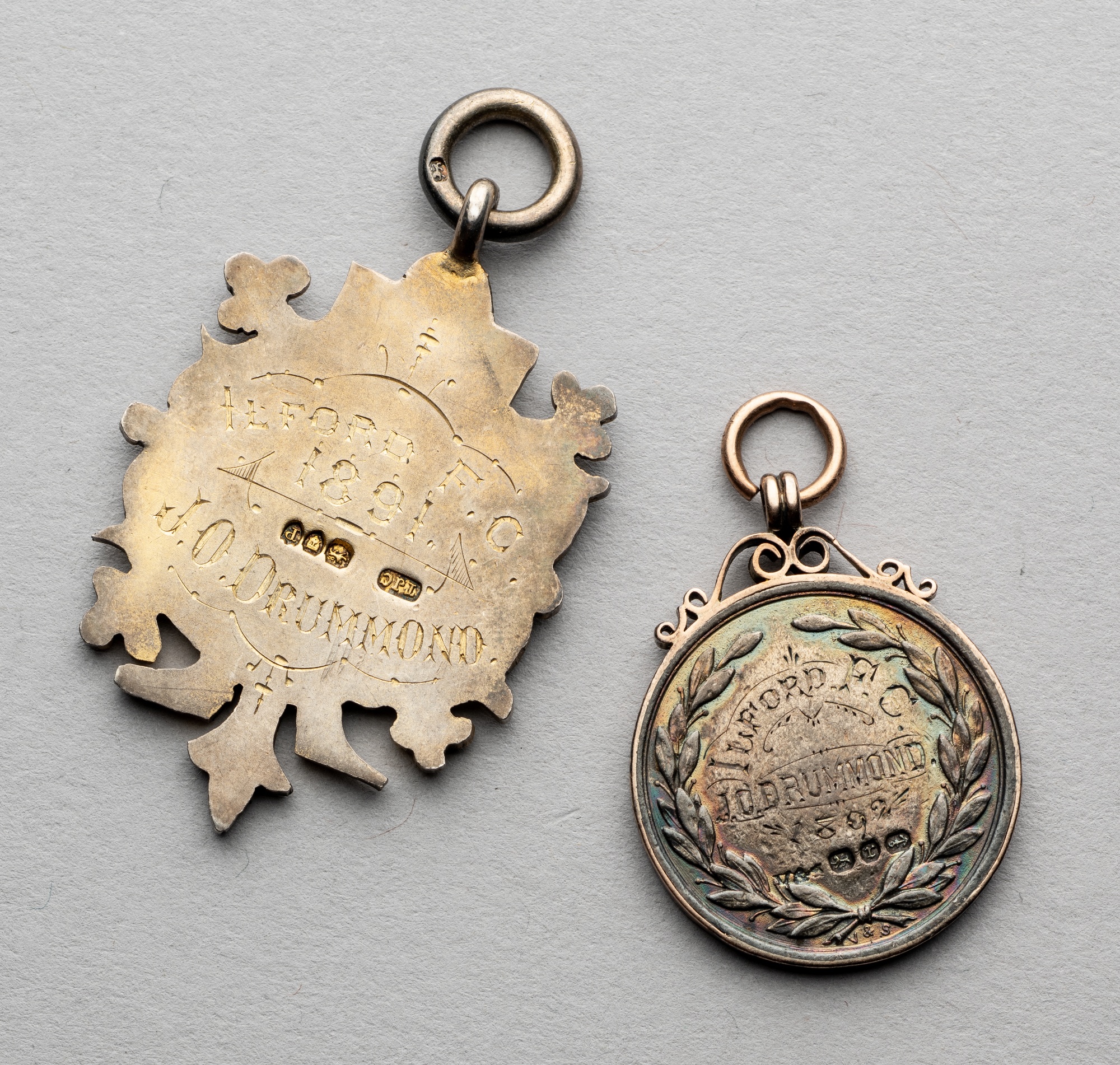 Two medals awarded to J O Drummond of Ilford FC, both in silver-gilt, one enamelled for the West Ham Hospital Cup of 1891 and the London FA Senior Cup of 1892 runners-up medal, overall wear, weight 26gms., (2) In the London F.A. Senior Cup Final Ilford were beaten 2-1 by Old Westminsters.