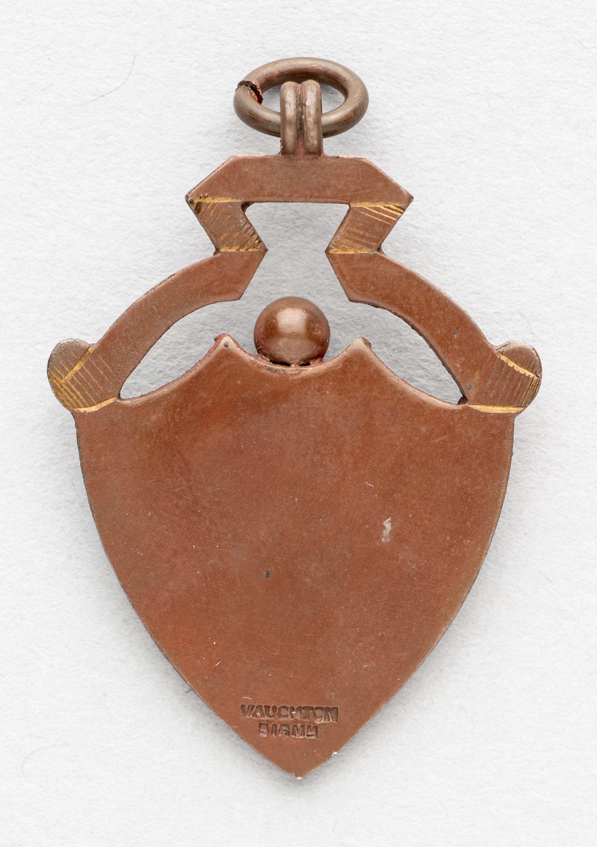 South London Football League Division One runners-up medal awarded to an Anerley FC player in season 1894-95, recipient unknown, shield shaped bronze medal, obverse with SOUTH LONDON LEAGUE 1894 - 1895 1ST DIVISION ANERLEY flanking three red enamelled roses, reverse vacant, bears Vaughton Birm stamp, 38 by 25mm. in original red leather bound fitted case with gilt tooling