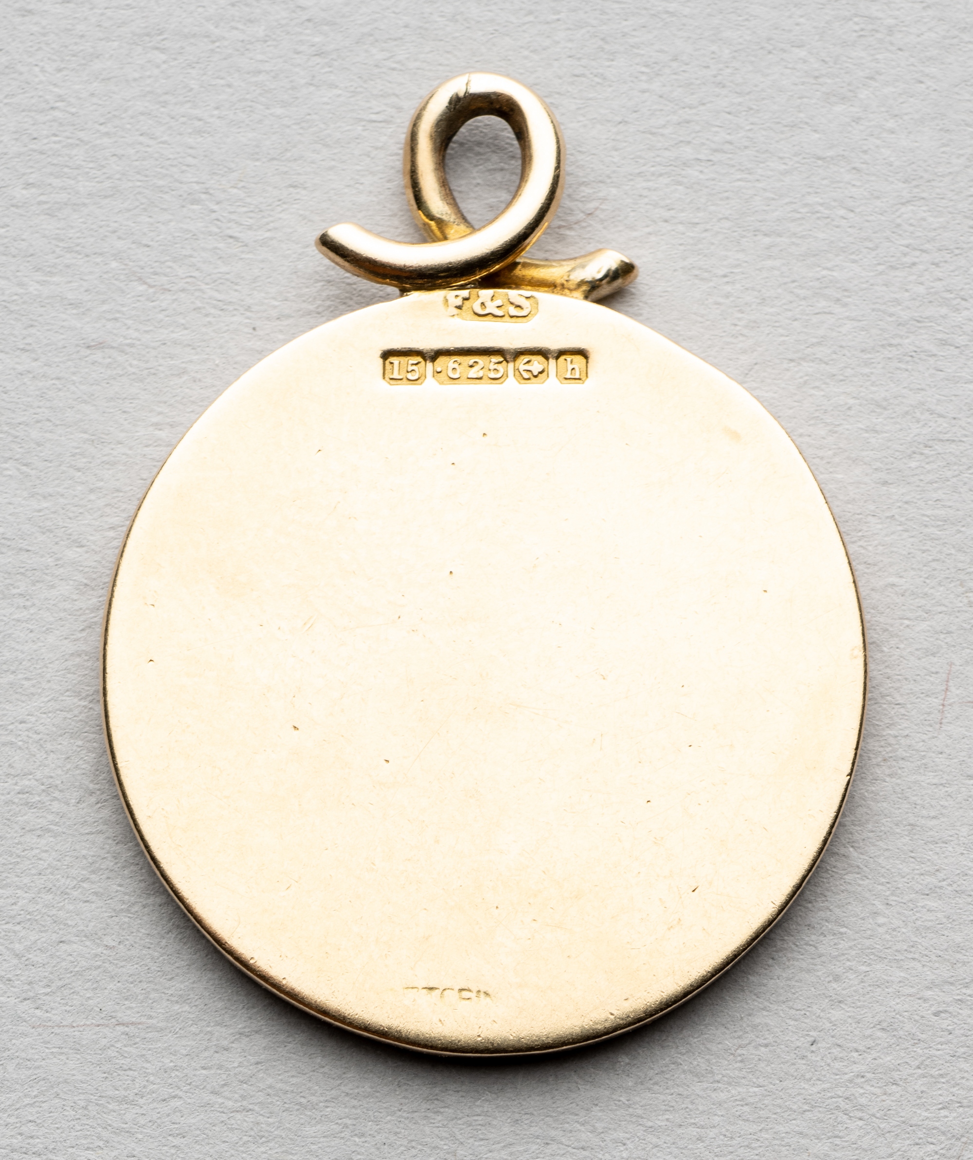 Football League Division Two championship medal awarded to a Bradford City player in season 1907-08, recipient unknown, 15ct gold, obverse enamelled with crests and ENGLISH LEAGUE CHAMPIONSHIP 2ND DIVISION 1907-8, reverse vacant, 15ct, Birmingham 1907 by Fattorini & Sons, with suspension loop, weight 15gms, diameter 27mm., in fitted associated case with gilt tooled lid Bradford City won the league on 54 points from Leicester Fosse.
