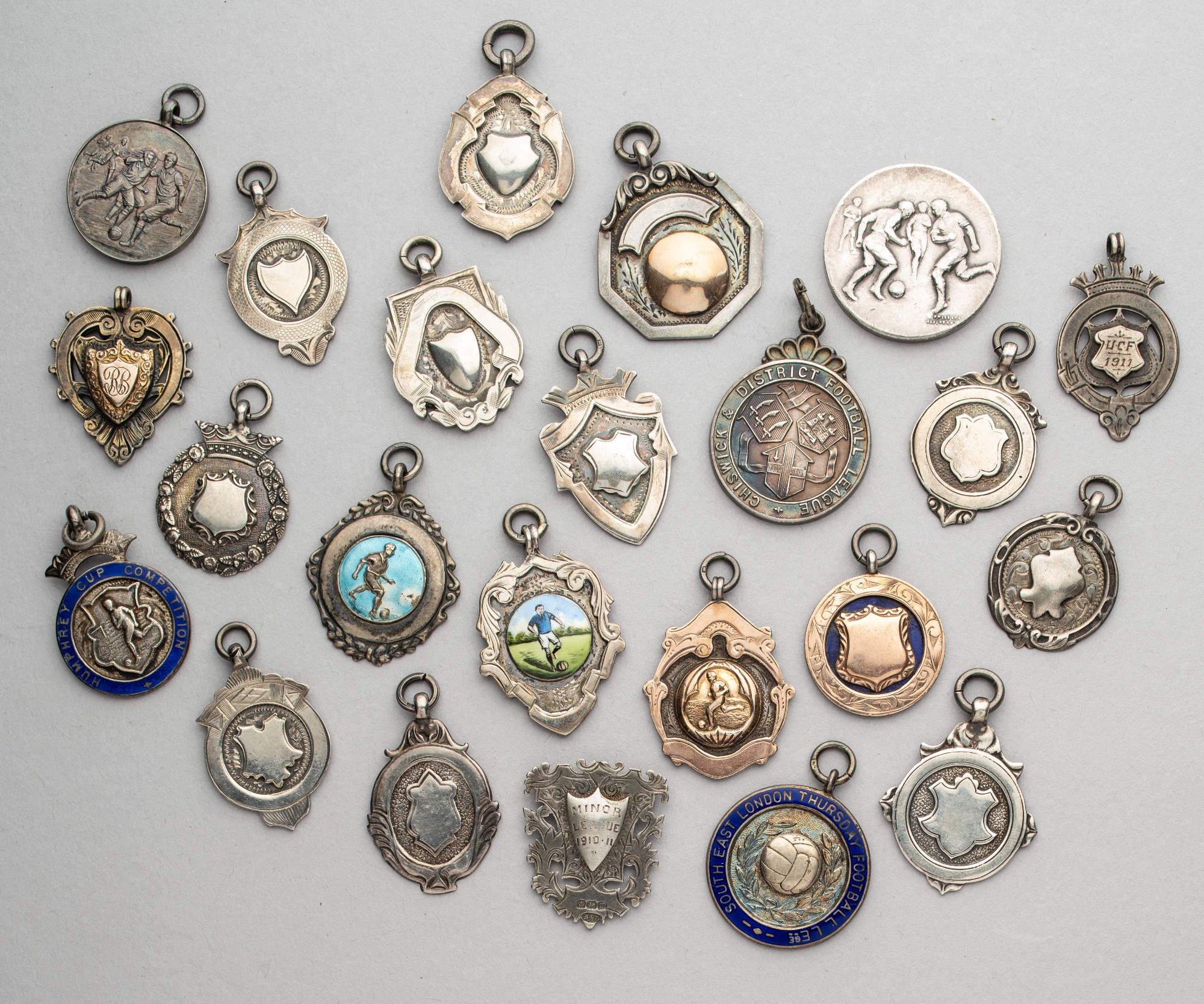 A miscellany of silver football medals, including one example in original case; five with gold mounting; four with enamelling; and 13 others, occasionally inscribed and including Chiswick & District FL, Humphrey Cup and South East London Thursday Football League, dated examples from 1910-11, 1930-31, 1920, 1929-30, 1933, 1927-28, 1911, 1920-21, each with bearing some light wear, (22)