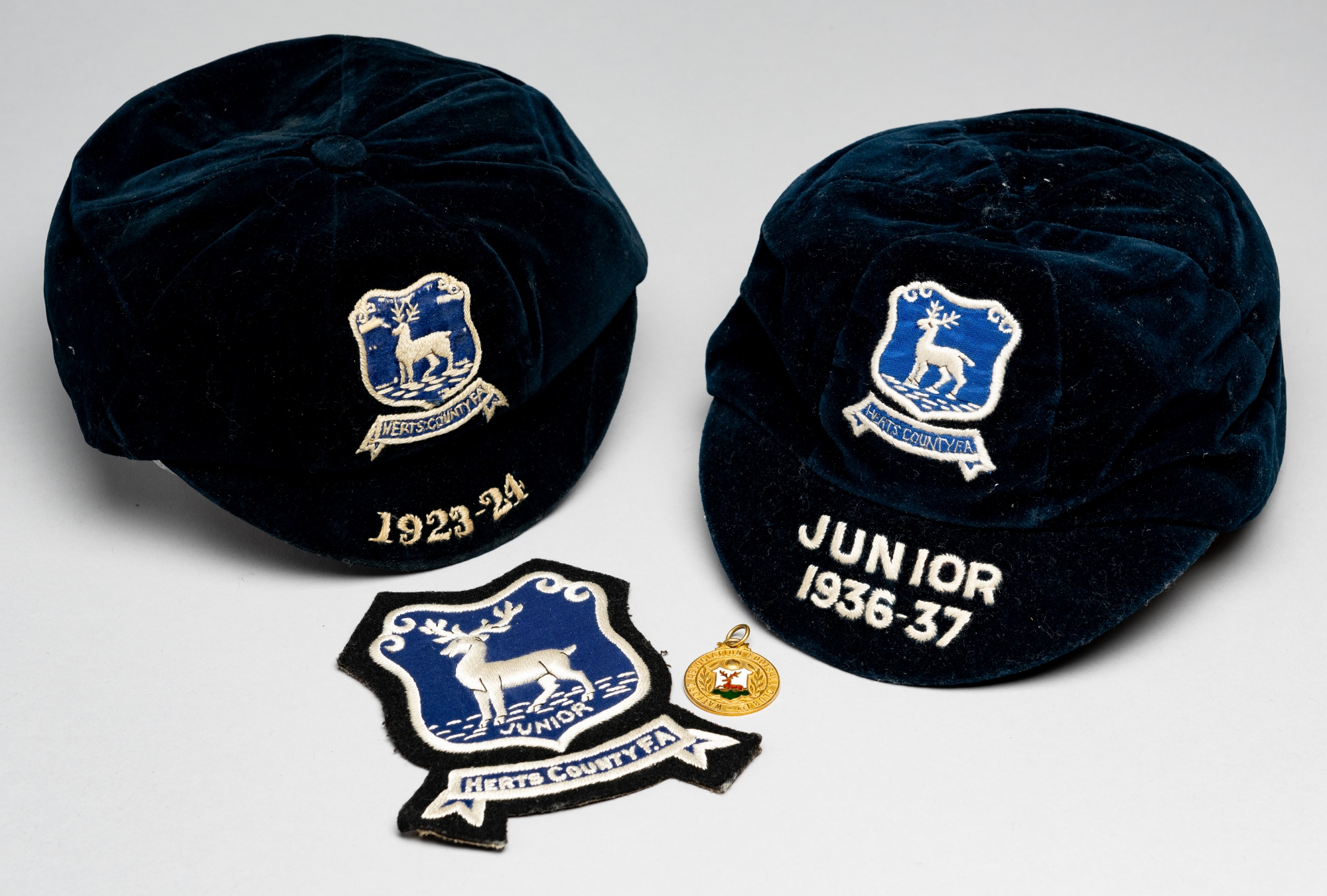 A group of memorabilia relating to Watford Association FC and the Herts County F.A., comprising a 9ct gold and enamel medal issued by Watford AFC, undated, but with hallmarked for Birmingham 1937, weight 9gms., diameter 23cm., together with two Herts County F.A. representative caps, both in navy blue velvet with county crest the first dated 1923-24, the other inscribed Junior and dated 1936-37; also a Herts County F.A. cloth shirt badge, good condition, (4)