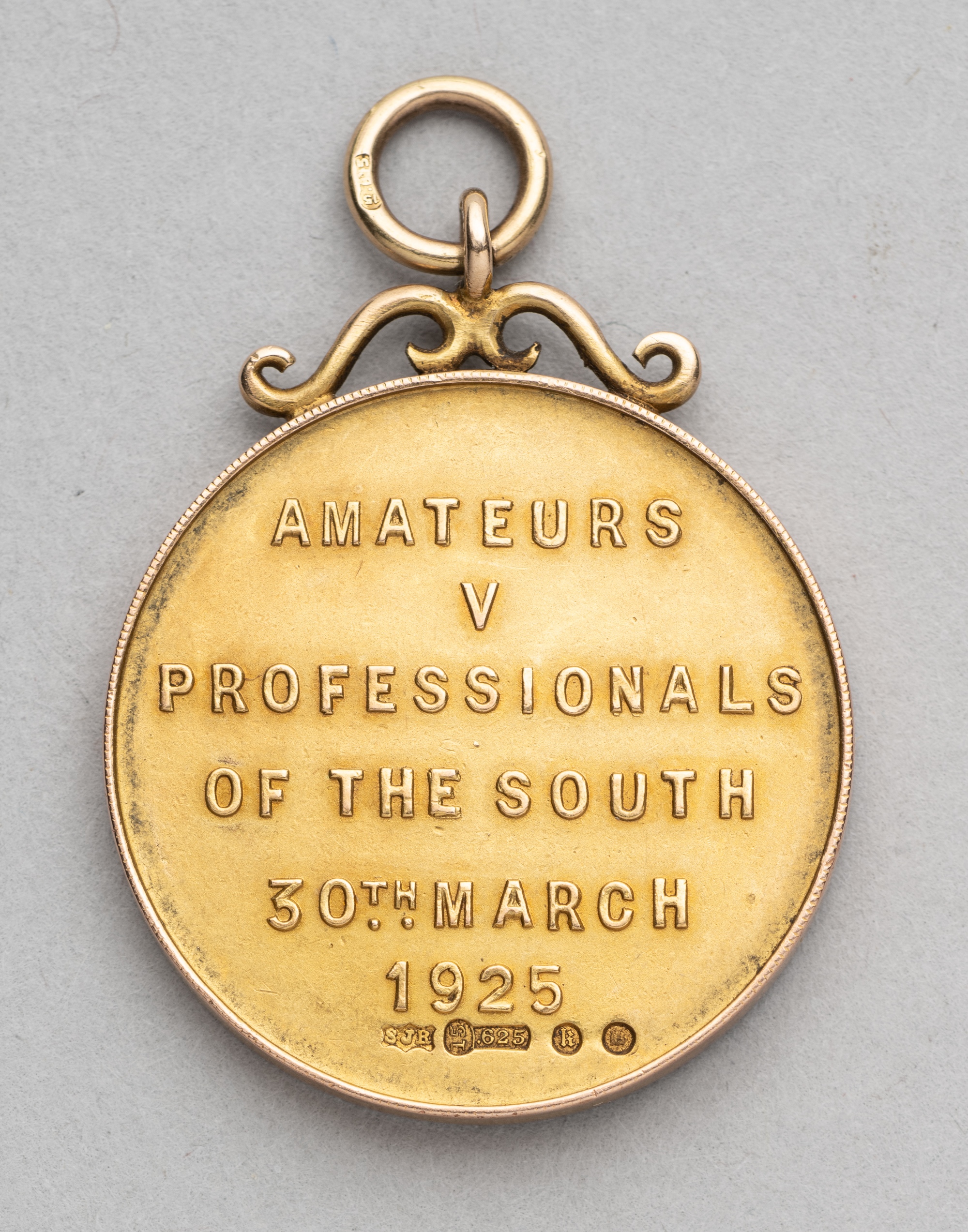 An interesting medal for a Trial Match staged by the Football Association at Arsenal FC's Highbury ground to experiment with proposed changes to the offside law, Amateurs v Professionals of the South, 30th March 1925, 15ct. gold, inscribed obverse and reverse, weight 22gr., diameter 29mm., condition good, no case The experiment was with the two-player rule (1925). The Scottish F.A. urged the change from a three-player to a two-player offside rule as early as 1893. Such a change was first proposed at a meeting of IFAB in 1894, where it was rejected. It was proposed again by the SFA in 1902, upon the urging of Celtic FC, and again rejected. A further proposal from the SFA also failed in 1913, after the Football Association objected. The SFA advanced the same proposal in 1914, when it was again rejected after opposition from both the Football Association and the Welsh F.A. Meetings of the International Board were suspended after 1914 because of the First world War. After they resumed in 1920, the SFA once again proposed the two-player rule in 1922, 1923, and 1924. In 1922 and 1923, the Scottish Association withdrew its proposal after English FA opposed it. In 1924, the Scottish proposal was once again opposed by the English FA, and defeated; it was, however, indicated that a version of the proposal would be adopted the next year. On 30 March 1925, the FA arranged a trial match at Highbury where two proposed changes to the offside rules were tested. During the first half, a player could not be offside unless within forty yards of the opponents' goal-line. In the second half, the two-player rule was used. The two-player proposal was considered by the FA at its annual meeting on 8 June. Proponents cited the new rule's potential to reduce stoppages, avoid refereeing errors, and improve the spectacle, while opponents complained that it would give "undue advantage to attackers"; referees were overwhelmingly opposed to the change. The two-player rule was nevertheless approved by the FA by a large majority. At IFAB's meeting later that month, the two-player rule finally became part of the Laws of the Game. The two-player rule was one of the more significant rule changes in the history of the game during the 20th century. It led to an immediate change in the style of play, with the game becoming more stretched, "short passing giving way to longer balls", and the development of the W-M formation. It also led to an increase in goalscoring: 4,700 goals were scored in 1,848 Football League Games in season 1924-25. This number rose to 6,373 goals (from the same number of games) in 1925-26. For the record, the Amateurs won the Trial Match at Highbury 3-1.