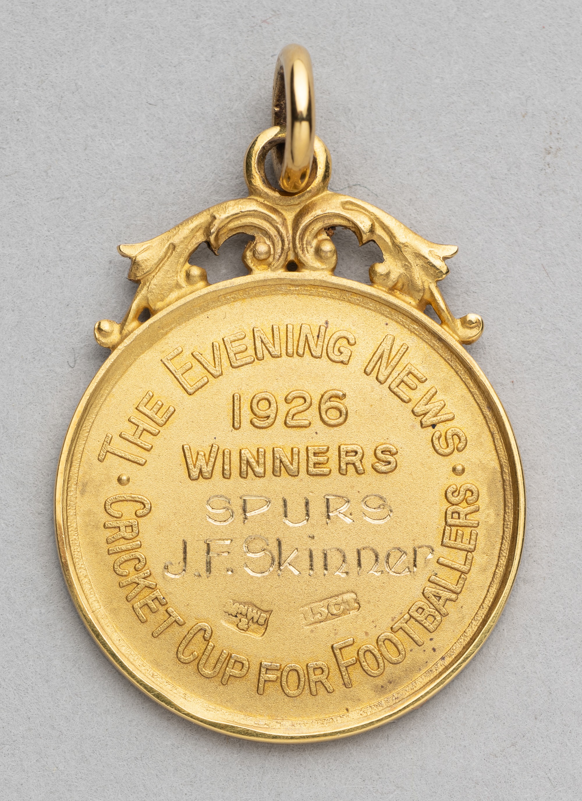 The Evening News Cricket Cup for Footballers winner's medal awarded to Jimmy Skinner of Tottenham Hotspur in 1926, obverse decorated with cricketers, reverse with full presentation inscription, weight 9gms., in original fitted case Jimmy Skinner played at wing-half and made 89 league appearances for Tottenham Hotspur.