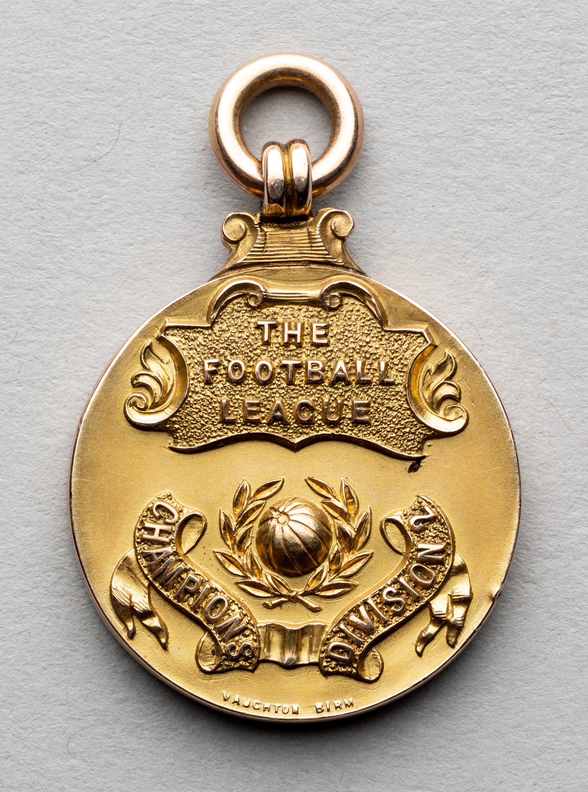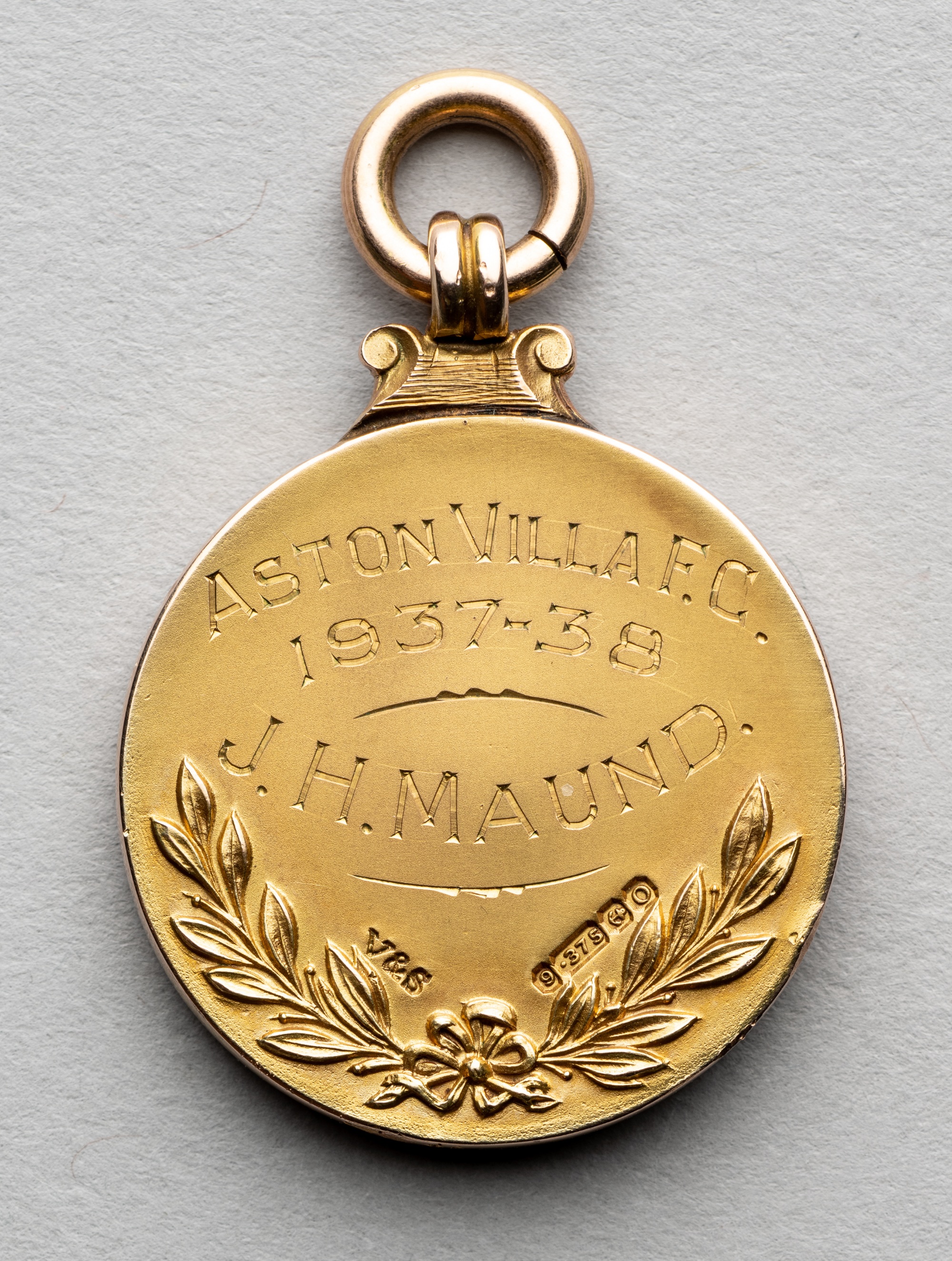 Football League Division Two championship medal awarded to Aston Villa's John Maund in season 1937-38, 9ct gold, obverse with football in relief and THE FOOTBALL LEAGUE CHAMPIONS DIVISION 2, reverse engraved with ASTON VILLA FC 1937-38 J.H MAUND, 9ct, Birmingham 1938 by Vaughton & Sons, with suspension ring, weight 22gms., diameter 28mm. with original fitted case with gilt tooling to lid John Maund (1916-1994) was a right-winger who made 47 League appearances for Villa. He later player for Walsall and would become their assistant-manager.