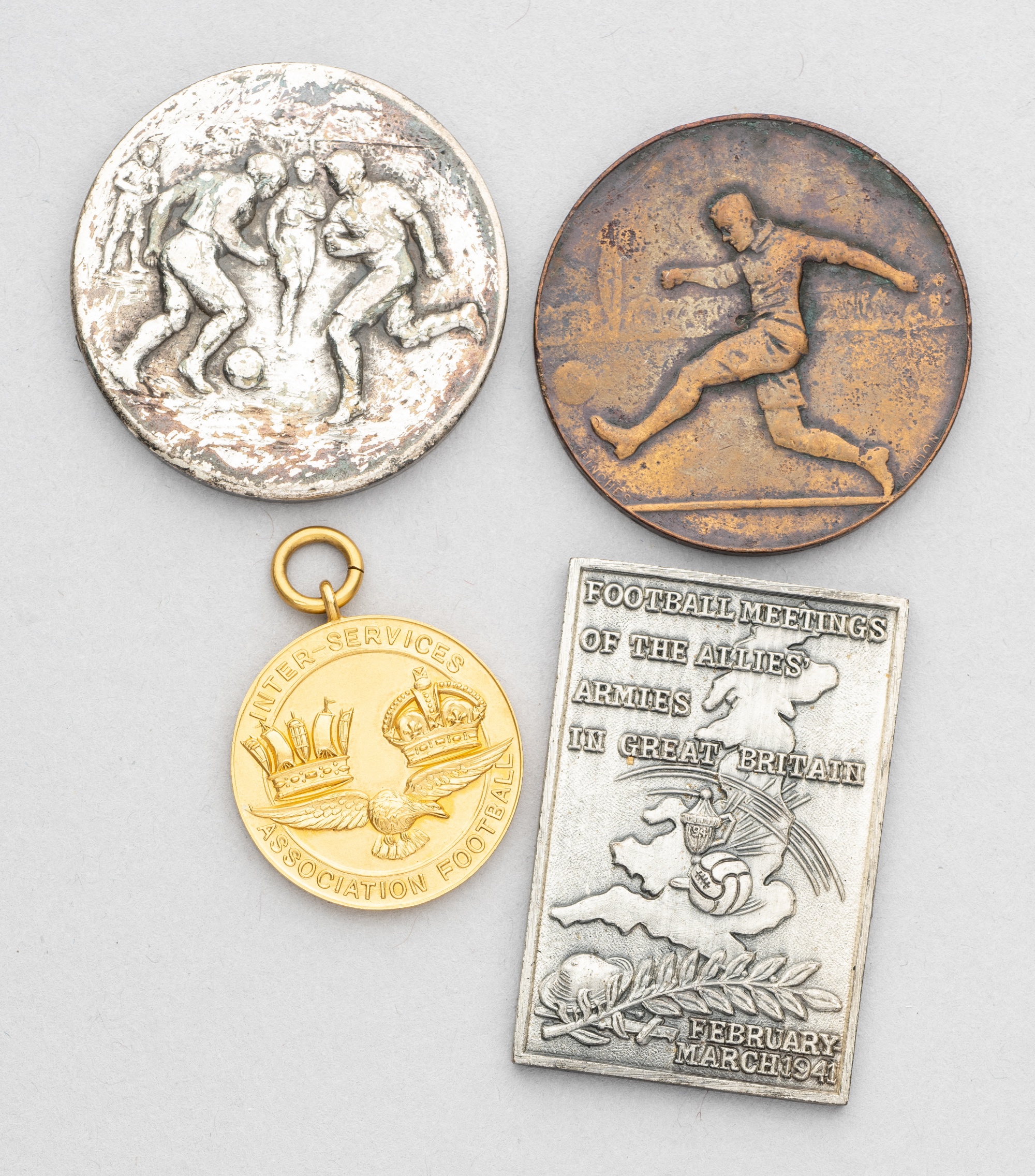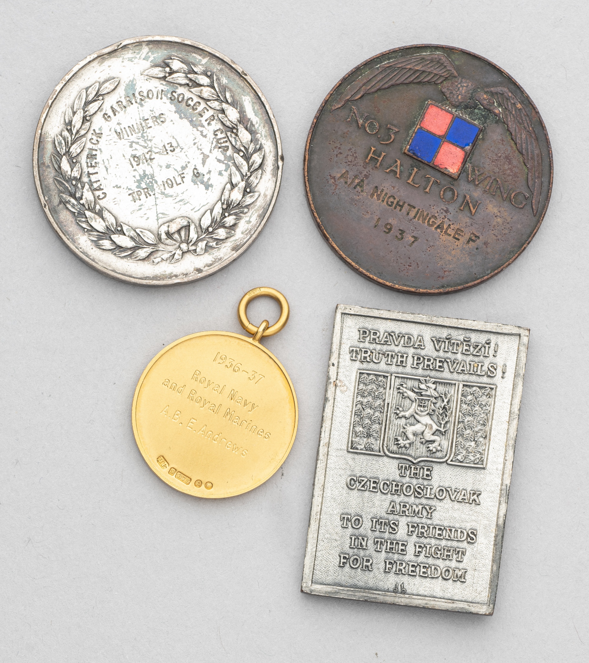 Collection of four medals relating to wartime and armed forces football, one 9ct gold Inter-Service medal, inscribed obverse and reverse, dated 1936-37, weight 10gms.; silvered medal plaque inscribed for a match with the Czecholslovak Army in England, February and March 1941, in original case of issue; another silvered medal for the Catterick Garrison soccer cup 1942-43; the other medal struck in bronze and enamel and inscribed no.3 Wing, Halton, dated 1937, (4)