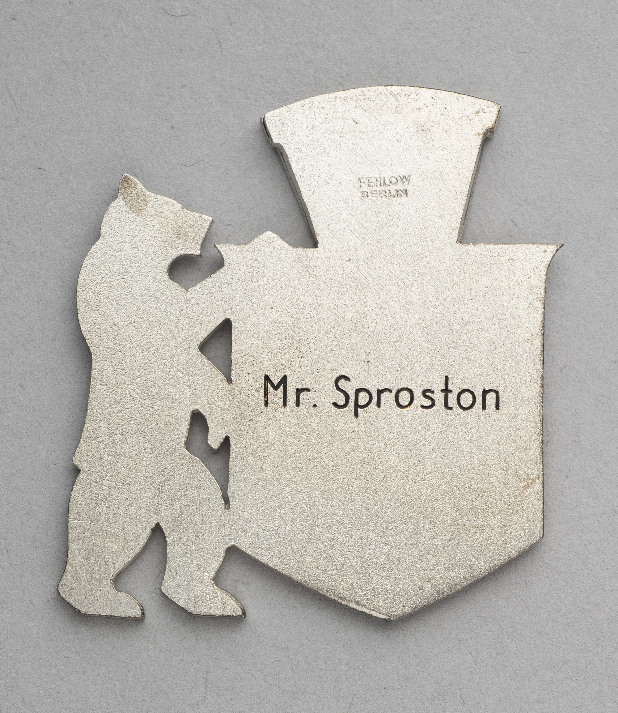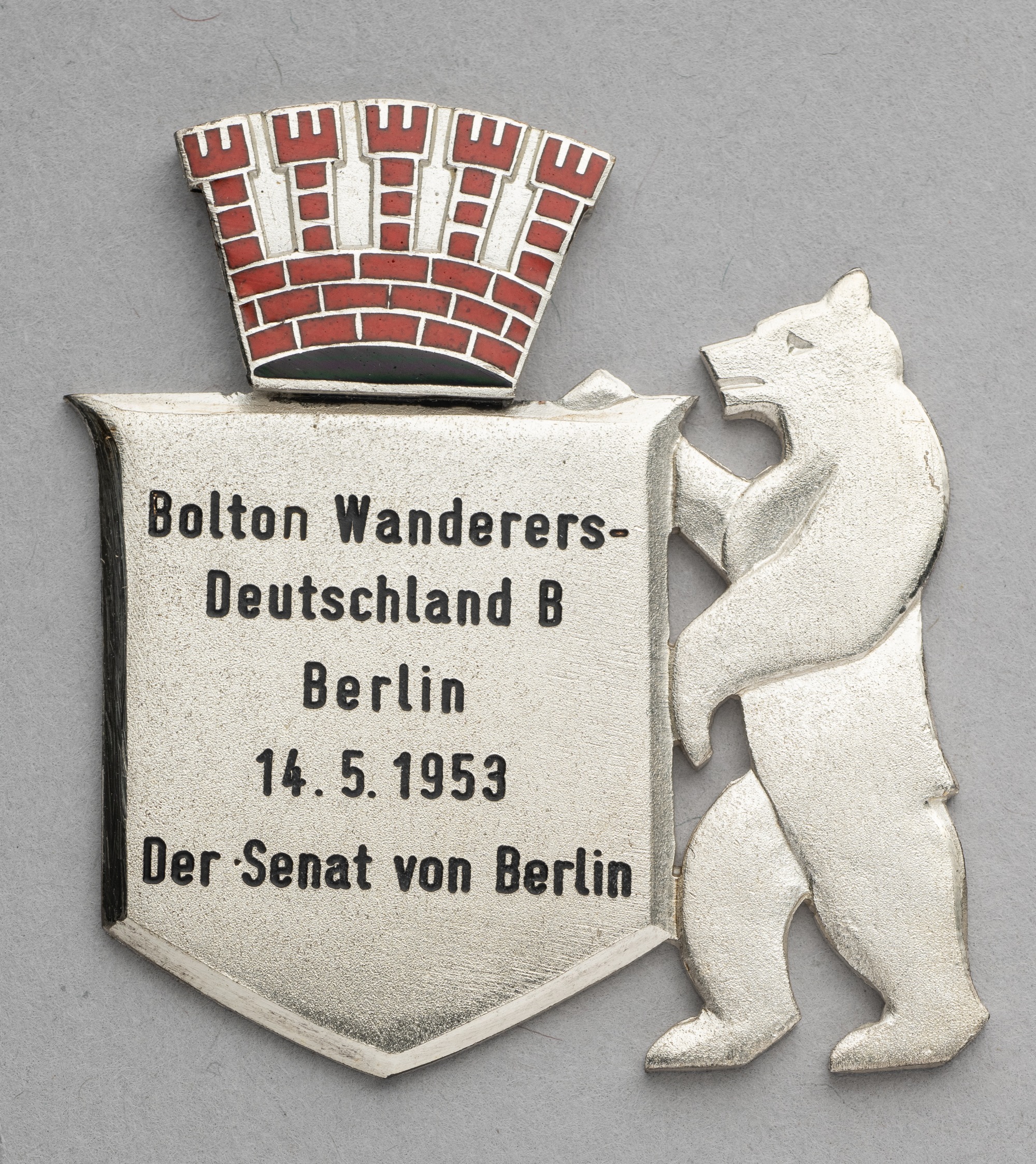 Medal plaque awarded to the footballer Bert Sproston on the occasion of Bolton Wanderers' match v Deutschland 'B' in Berlin, 14th May 1953, designed with a bear holding a shield, named to Sproston on reverse, makers mark Fehlow Berlin, white metal and enamel, 5 by 4cm., original fitted case, damage to hinge on case, medal good