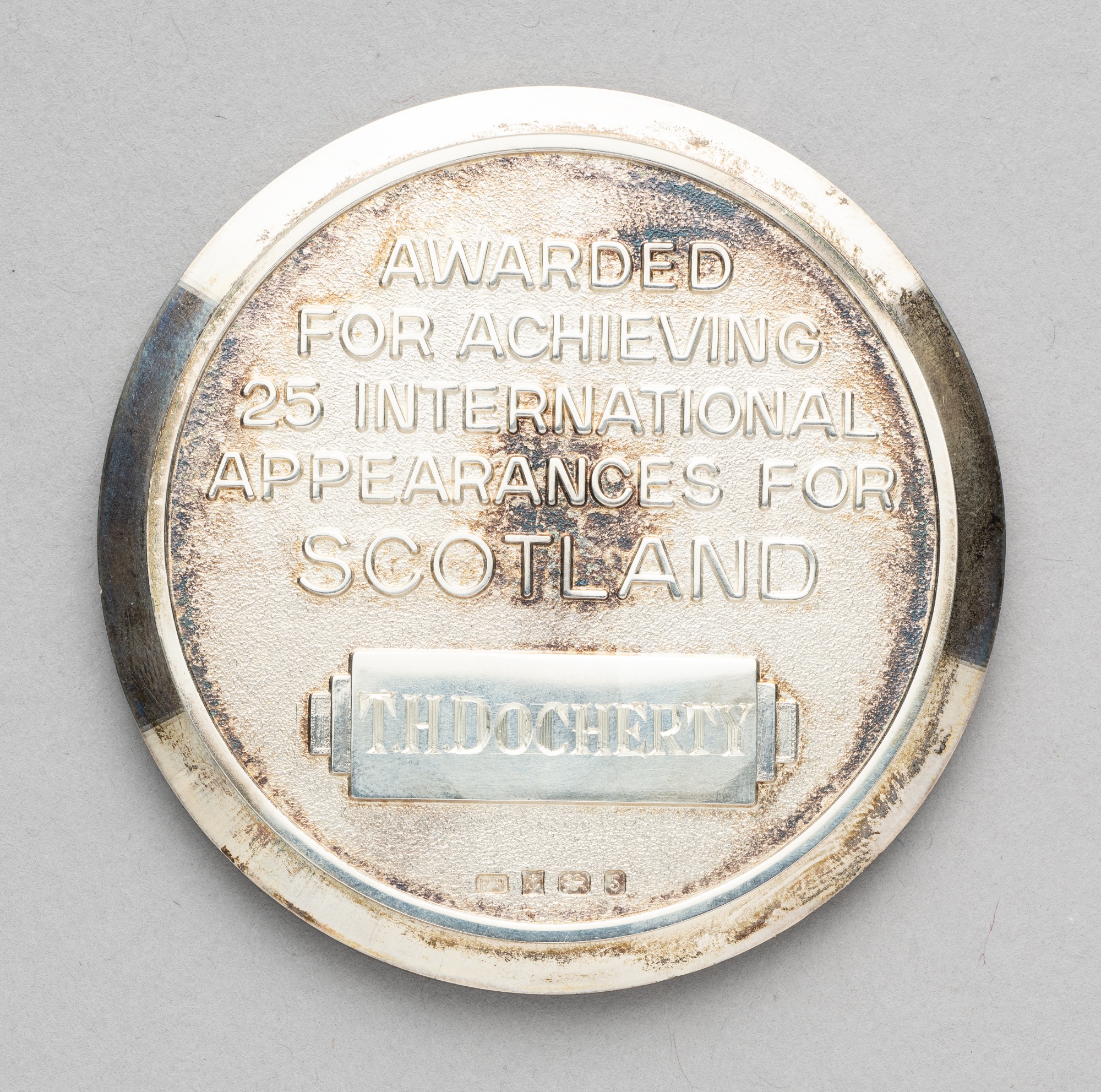 Silver Scottish Football Association medal awarded to Tommy Docherty for making 25 international appearances for Scotland, fully inscibed obverse and