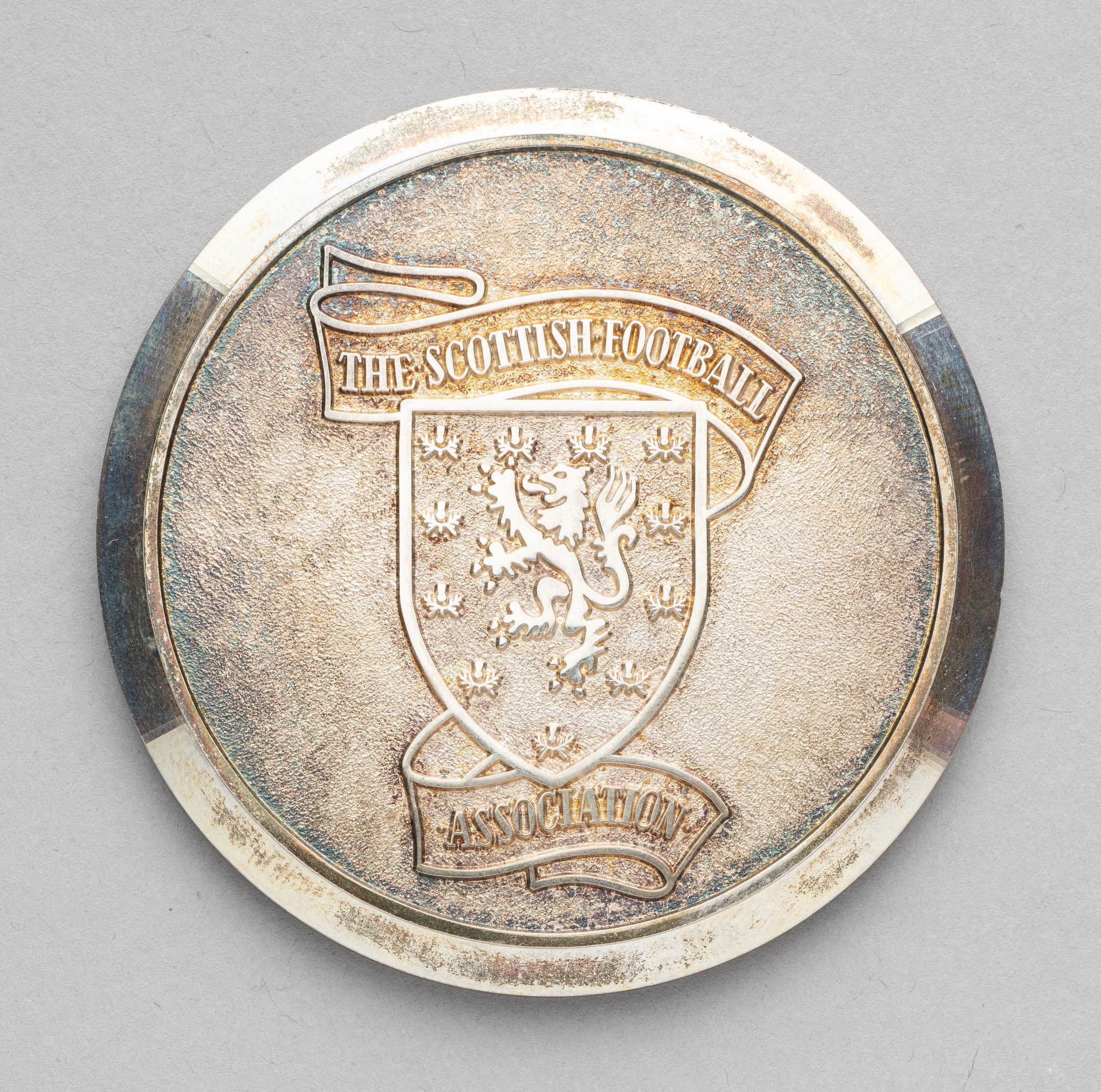 Silver Scottish Football Association medal awarded to Tommy Docherty for making 25 international appearances for Scotland, fully inscibed obverse and reverse, diameter 68mm., weight 160gms., tarnished, in original fitted case Tommy Docherty spent the majority of his playing career at Preston North End. He later became a football manager with his finest hour coming in 1977 when he led Manchester United to victory in the F.A. Cup.