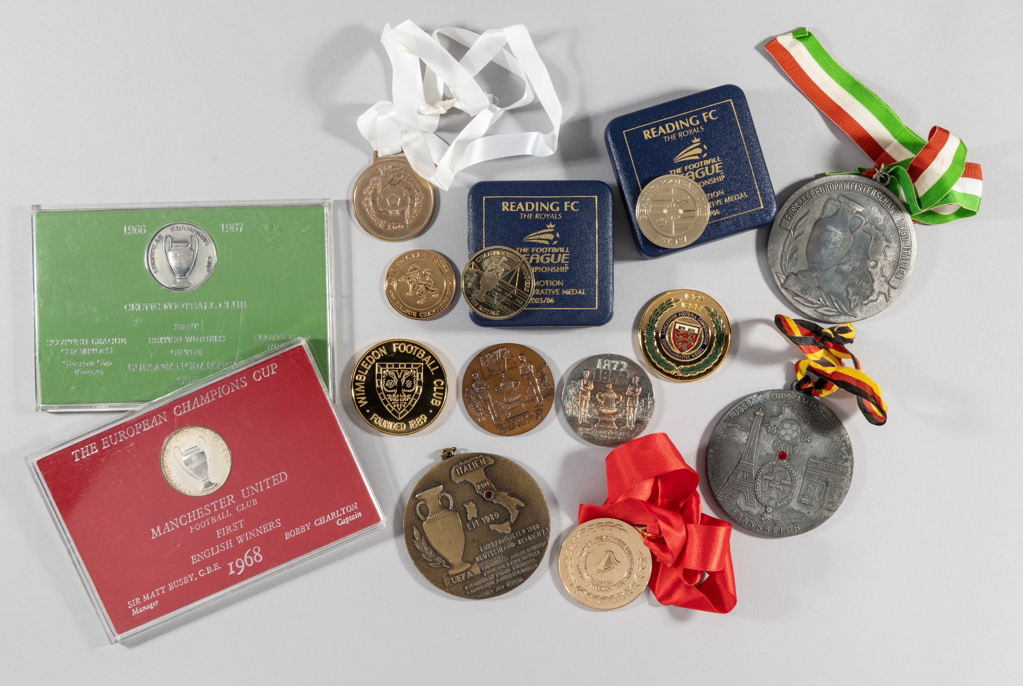 Collection of commemorative football medals, including Celtic 1967, Manchester United 1968 European Cup Winners; cased pair Centenary of FA Cup; four commemorating European Championships; 90th anniversary Lancs. Combination; Everton Liverpool 1986 Cup final; 100th FA Cup final; Cannon 1985-86 sponsorship; Wimbledon FC; Peterborough United 1973-74; Football League 1978-79; Scottish FL Centenary; Manchester United 1966-67; Aston Villa 1980-81; England v Cameroon 1991; and three relating to Reading FC, none struck in precious metal, most examples cased, (qty)