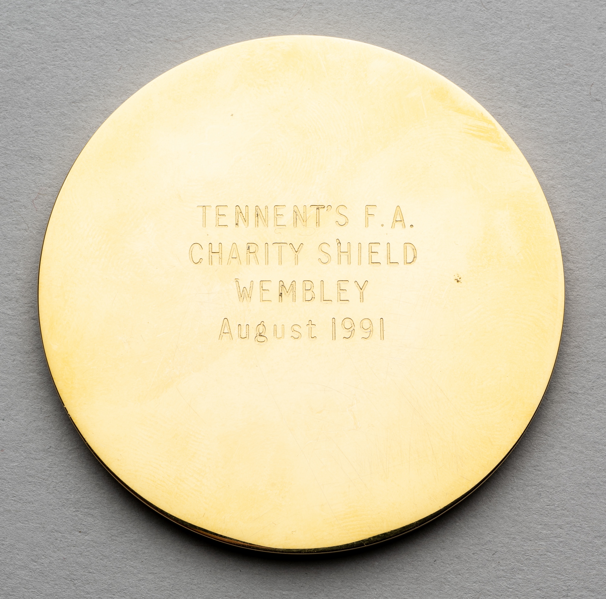Tennent's F.A. Charity Shield sponsor's medal, Arsenal v Tottenham Hotspur, played at Wembley, 10th August 1991, obverse bearing sponsor's emblem and TENNENT'S F.A. CHARITY SHIELD, reverse engraved TENNENT'S FA CHARITY SHIELD WEMBLEY AUGUST 1991, gilt metal, diameter 63mm., in pouch bag This fixture results in a 0-0 draw.