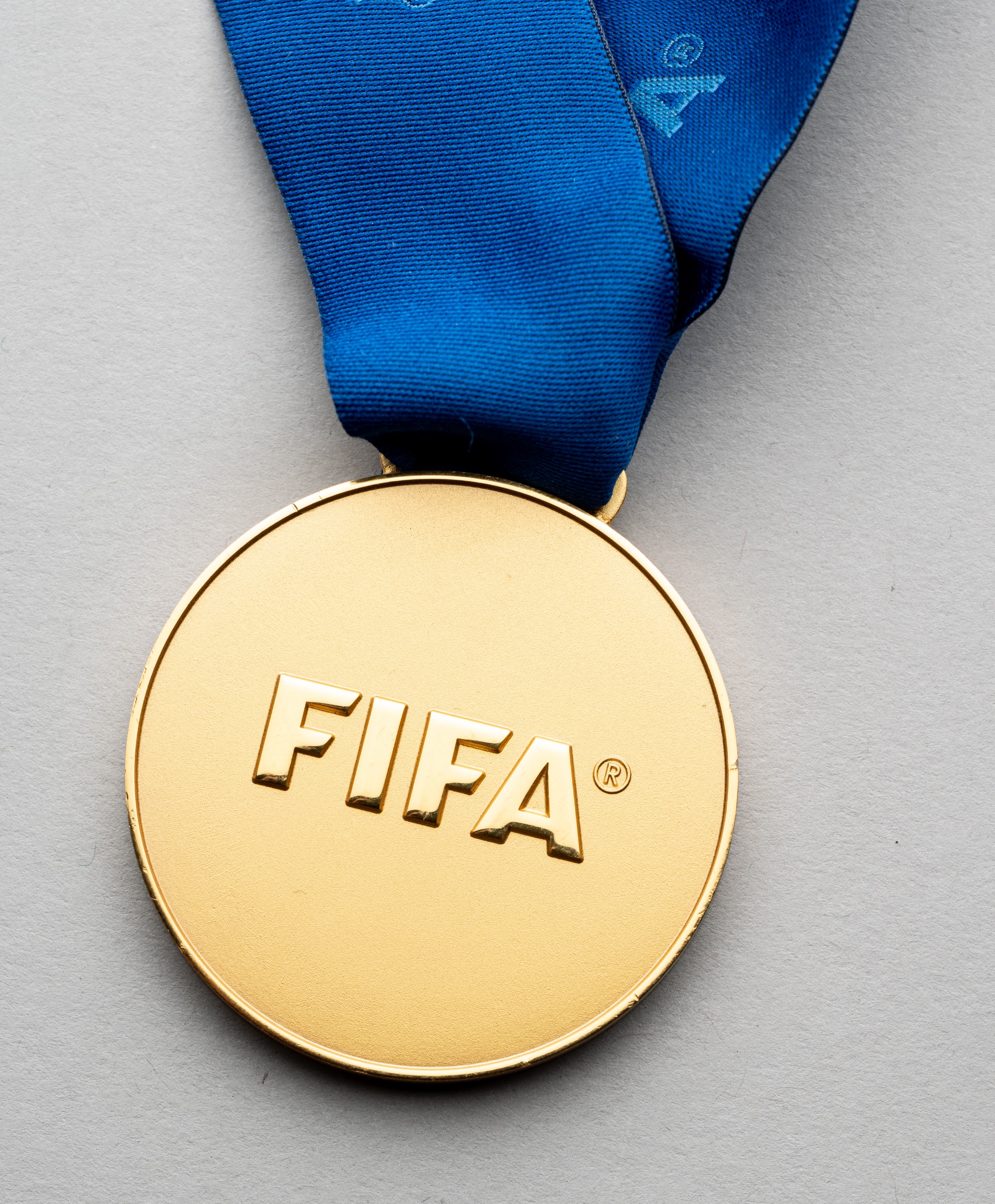 2009 FIFA Club World Cup winner's medal, recipient unknown, gilt metal medal, obverse with trophy in relief and FIFA CLUB WORLD CUP WORLD CHAMPION UAE 2009, reverse with FIFA in relief, with blue FIFA ribbon, diameter 50mm. FC Barcelona defeated Estudiantes 2-1 in the match played in Abu Dhabi, 19th December 2009.