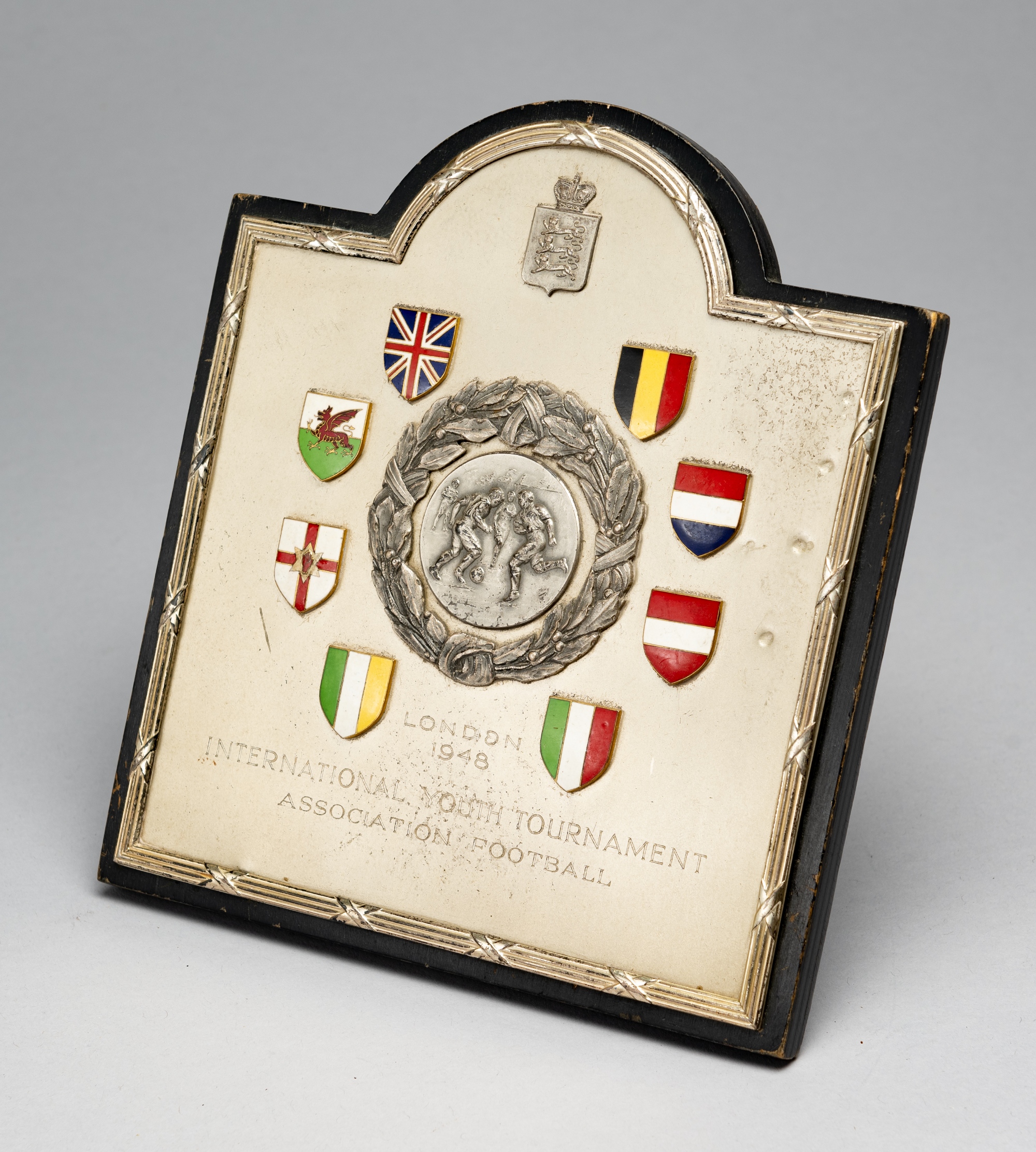 A Football Association trophy plaque commemorating the first FIFA U-18 Youth tournament, held in London, 15th-17th April 1948, the silvered plaque bearing central football match medallion flanked by eight enamelled competing nations flags, inscribed, mounted on a wooden easel back, 19 by 17cm., slight surface wear with pitting and dents This competition later became the UEFA European U-19 championships. This inaugural tournament was competed for by England, Wales, Northern Ireland, Republic of Ireland, Austria, Belgium, Italy and Netherlands. The tournament was won by England who beat the Dutch 3-2 in the final.