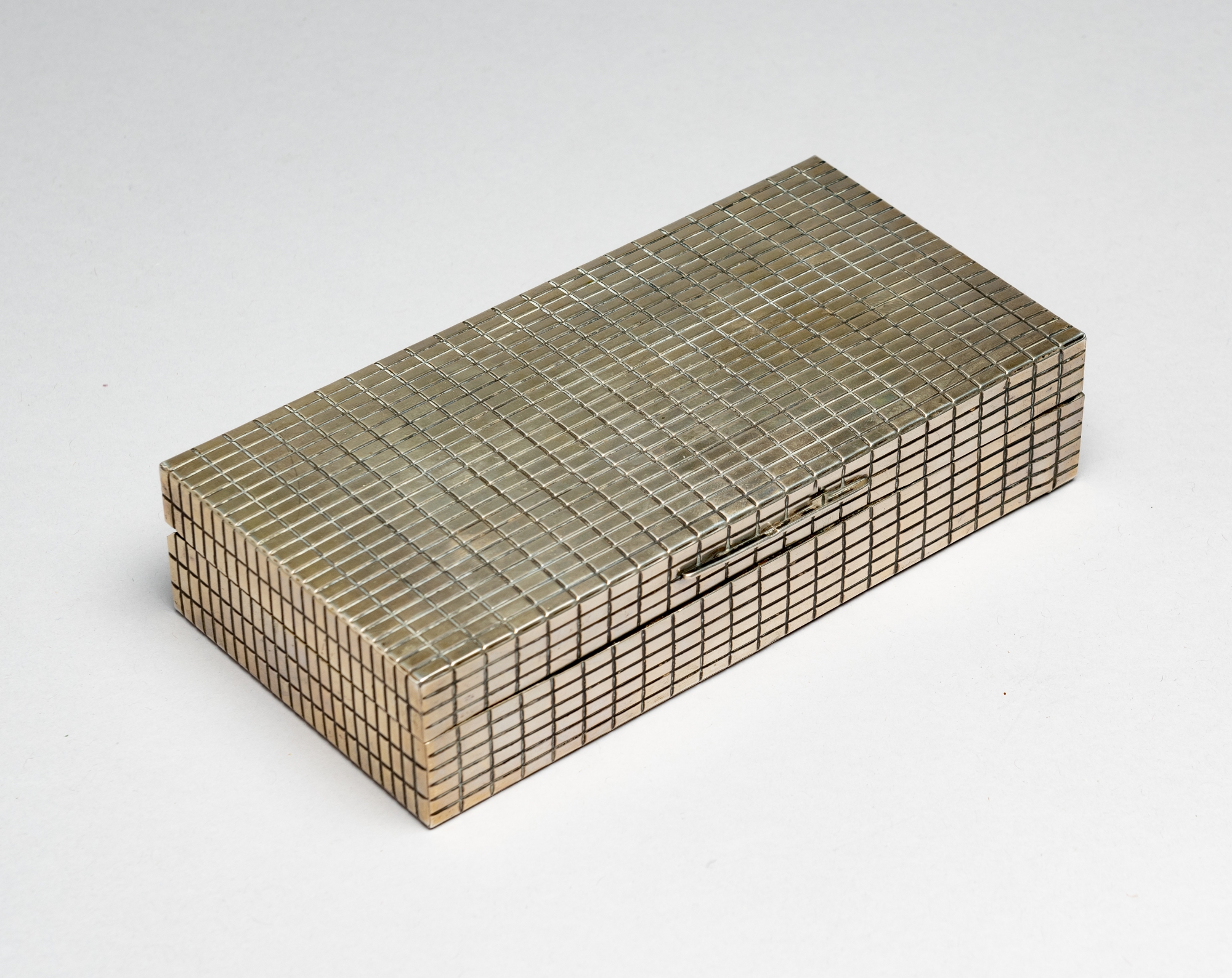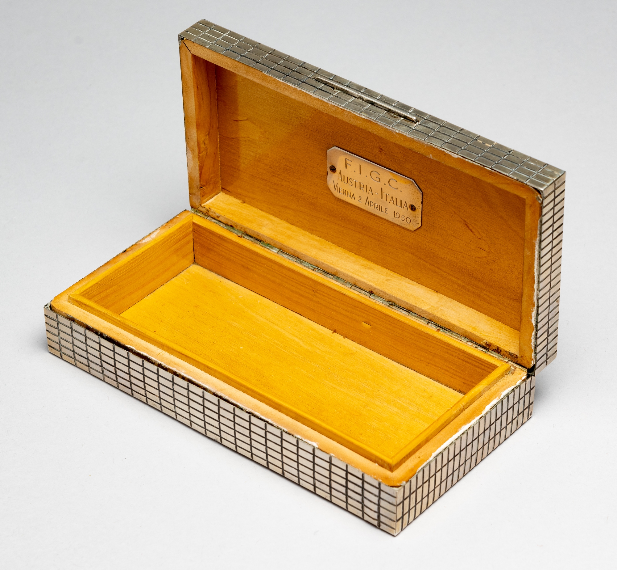 An Italian F.A. presentation on the occasion of the international match v Austria, played in Vienna, 2nd April 1950, in the form of a white metal cigarette box with cedar wood interior, the interior of the lid set with plaque inscribed with FIGC Austria - Italia Vienna 2 Aprile 1950, 4 by 18 by 15cm., good condition, minor surface marks, no visible hallmark Austria defeated Italy 1-0.