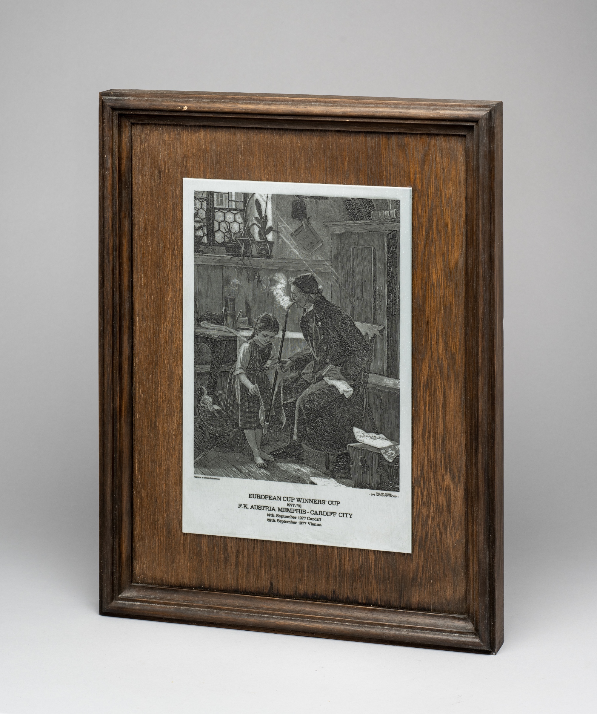 Presentation item for the FK Austria Memphis v Cardiff City 1977-78 European Cup Winners' Cup tie, presentation in a wooden frame 16 by 13in. containing and engraved 12 by 8in. plate of what appears to be an Austrian scene from the 19th century, the plate is engraved European Cup Winners' Cup 1977-78 F.K. Austria Memphis v Cardiff City 13th September Cardiff, 28th September Vienna