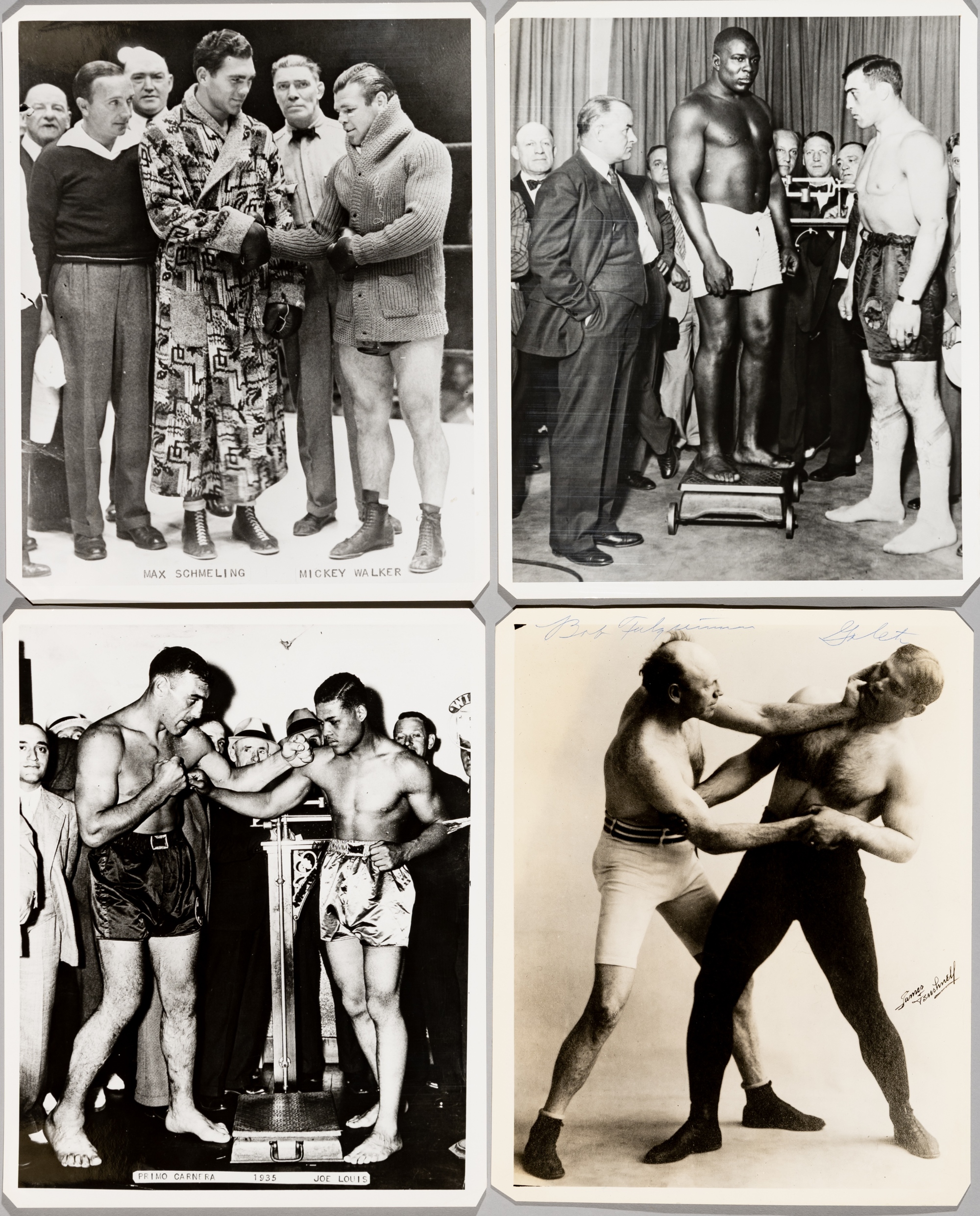 Boxing: Jack Johnson and George Godfrey four sepia 10 by 8in. heavyweight boxer photographs, two of Jack Johnson and two of George Godfrey, all photographs with clipped corners but not affecting the images, one with blue ink writing to upper margin, (4)