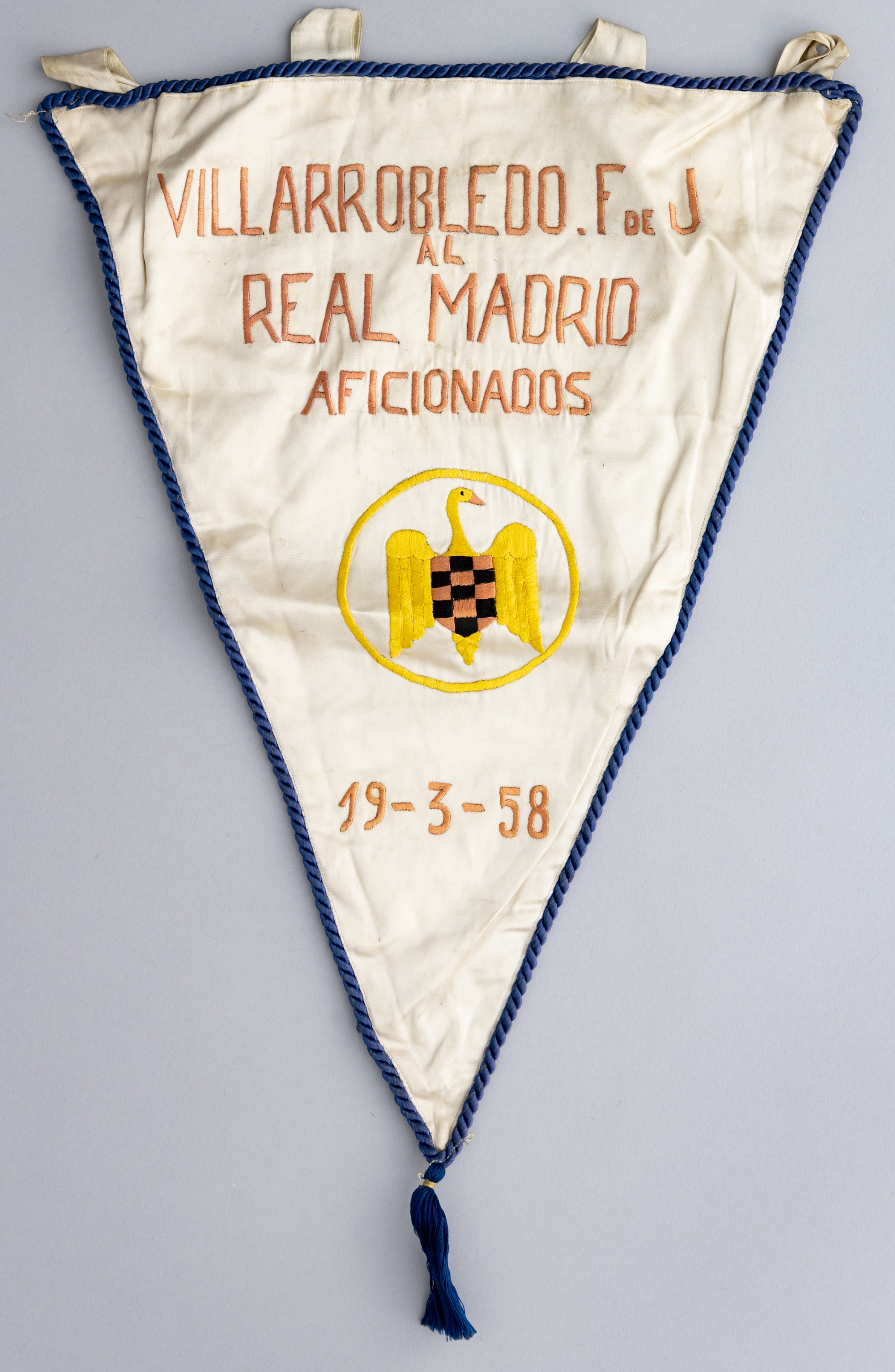 A rare pennant issued for Real Madrid's visit to Polideportivo Villarobledo for the opening of the stadium Campo Nuestra Senora De La Caridad, 19th March 1958, white silk embroidered with inscription and crest, reverse in blue silk, 48 by 35cm., good condition