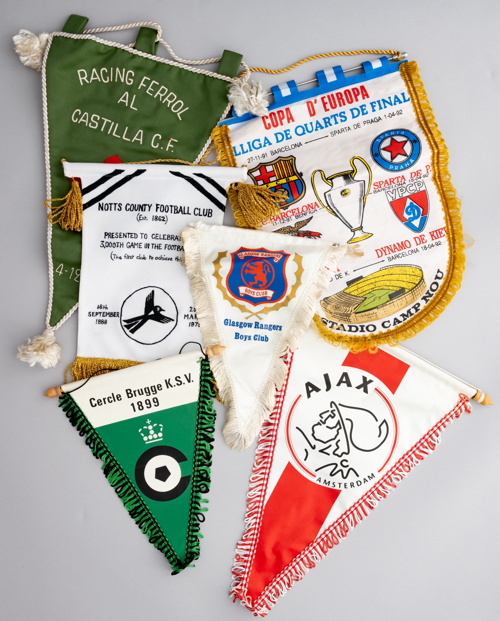 A group of six football pennants, comprising the oldest dated 4.12.77 for Racing Ferrol Al Castilla CF; a pennant celebrating Notts County FC's 3,000th game in the Football League (first club to achieve this figure) 25th March 1975; issues for Ajax, Bruges and Glasgow Rangers; and a pennant for the European Cup quarter-finals 1991-92, Barcelona, various material and sizes, generally in good condition, (6)