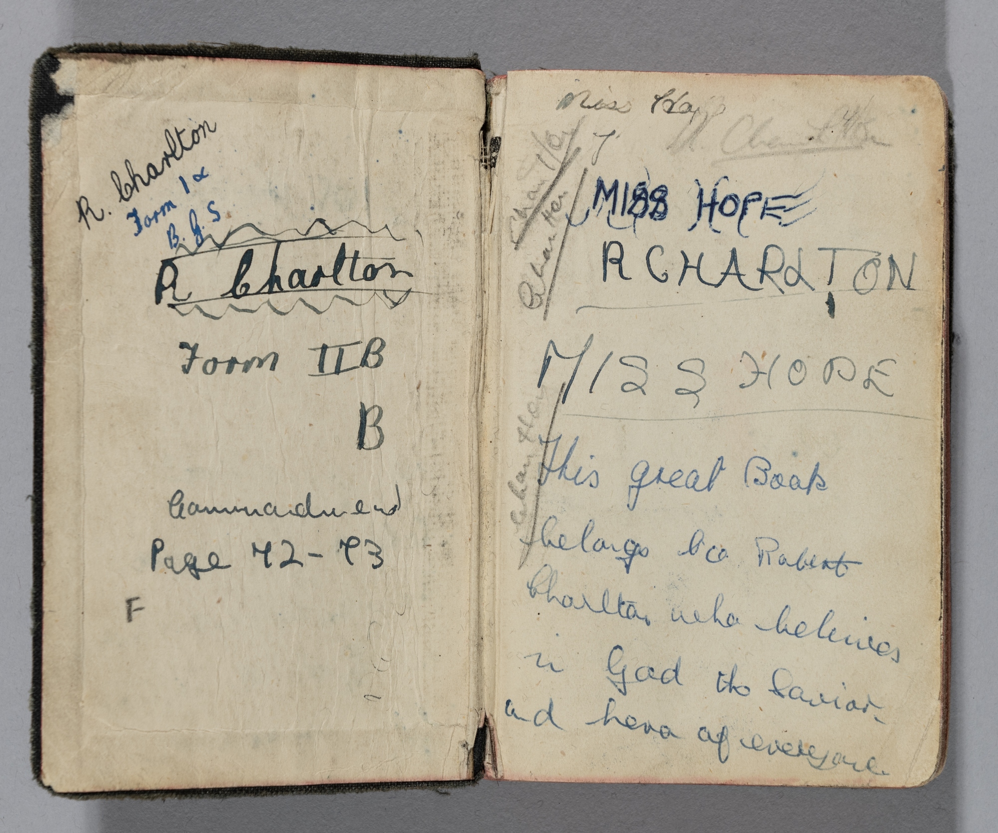 Bobby Charlton's childhood Holy Bible, 240-page, the leather bible with HOLY BIBLE in silver on spine, on the inner cover bearing R. CHARLTON in ink and pen, with signature in pencil, with information for school classes Form IX, Form IIB and possible teacher's names Miss Hope, the inside back cover bearing address for 114 Beatrice Street, Ashington, North'd and Chuck [Bobby's nickname] Charlton Form 2B Room II in blue ink, hand written script on inner back pages possibly by Charlton; come with Halba Travel Ltd (Sir Bobby Charlton, a Company Director) letterhead relating to the authenticity of the bible, condition is fair to good with wear to cover, spine and inner pages 114 Beatrice Street, Ashington, Northumberland, was the childhood home of Sir Bobby Charlton and his elder brother Jack. They both attended Hirst North Primary School. Bobby later attended Morpeth Grammar School before famously experiencing his first 'football transfer' after it was realised that it was a rugby school. With the help of his parents and his primary school headmaster Mr James Hamilton, who was aware of Bobby's talent, they managed for Bobby to attend Bedlington Grammar. Remarkably, this bible was bought in the 1980s at a jumble sale organised by Remploy in the Blackfriars area of Salford, Greater Manchester. The buyer bought the bible entirely unaware of the inscriptions and was alerted to the potential significance by her son, before writing to Sir Bobby Charlton's company Halba Travel Ltd. for confirmation. So a truly serendipitous discovery.