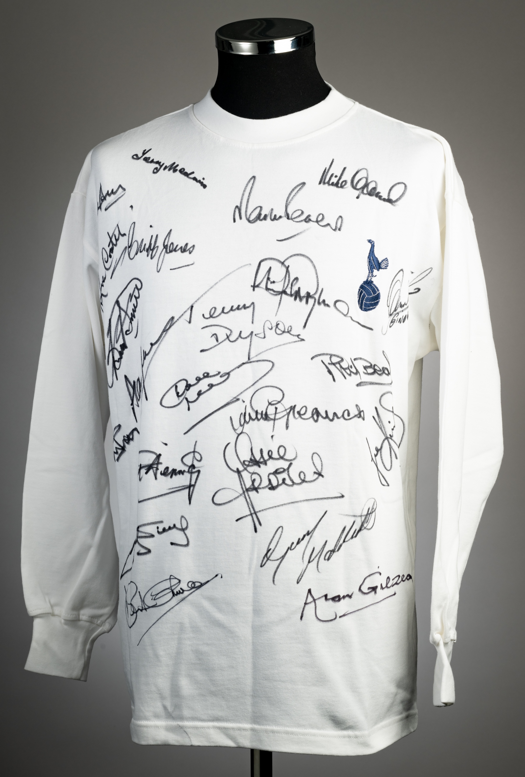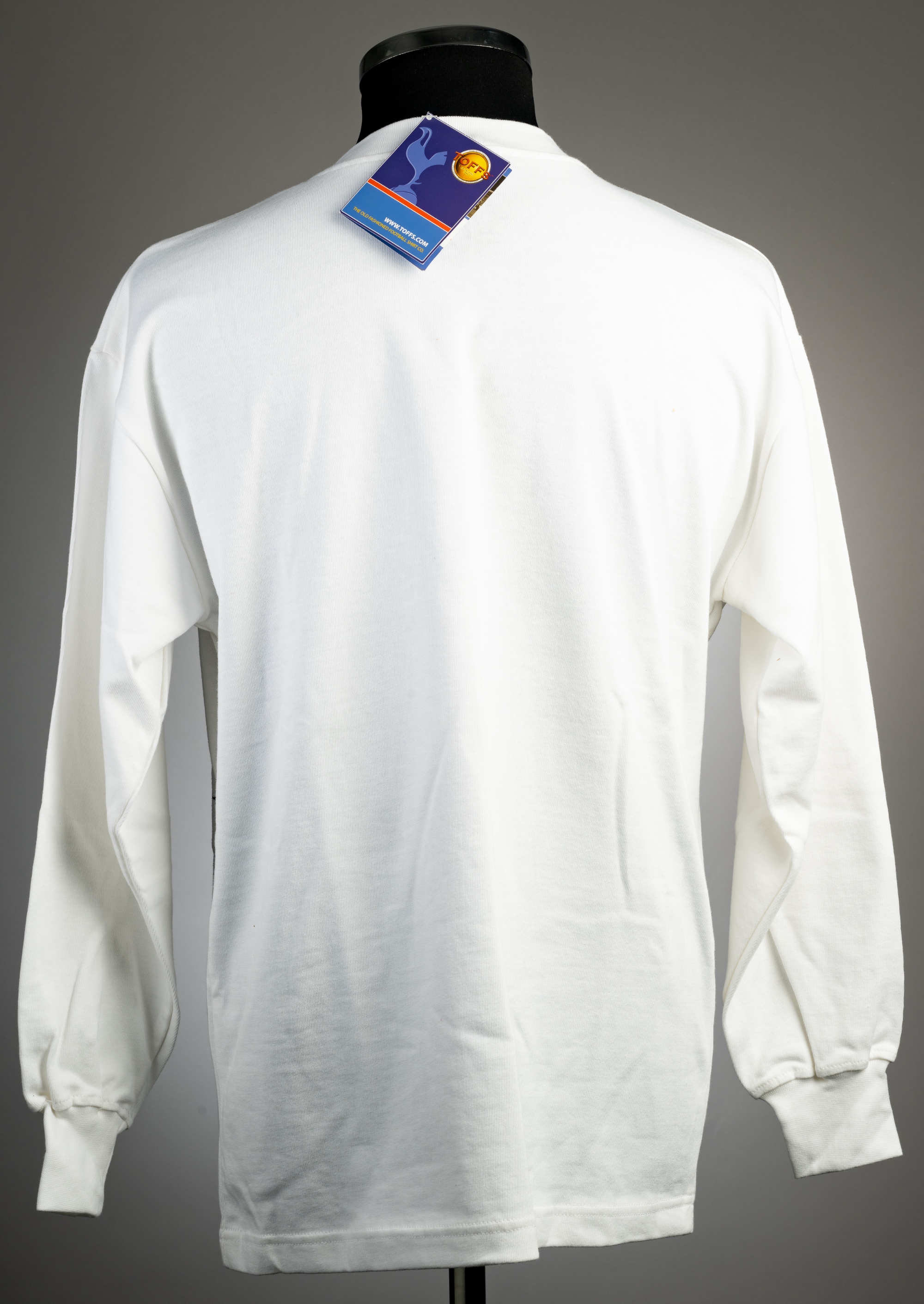 White Tottenham Hotspur replica jersey, signed by legends of the club, Toffs, long-sleeved with embroidered club crest and neck label, size M, signed in black marker pen by approximately 22 legends, including Martin Chivers, Terry Medwin, Mike England, Pat Jennings, Martin Peters, Paul Allen, Cliff Jones, Ralph Coates, David Ginola, Terry Dyson, Alan Gilzean, Dave Mackay, Phil Beal, Jimmy Greaves, Ledley King, Ossie Ardiles, Gary Mabbutt, and others, bears retail tag Provenance: Martin Chivers Collection (Lots 361 to 366).