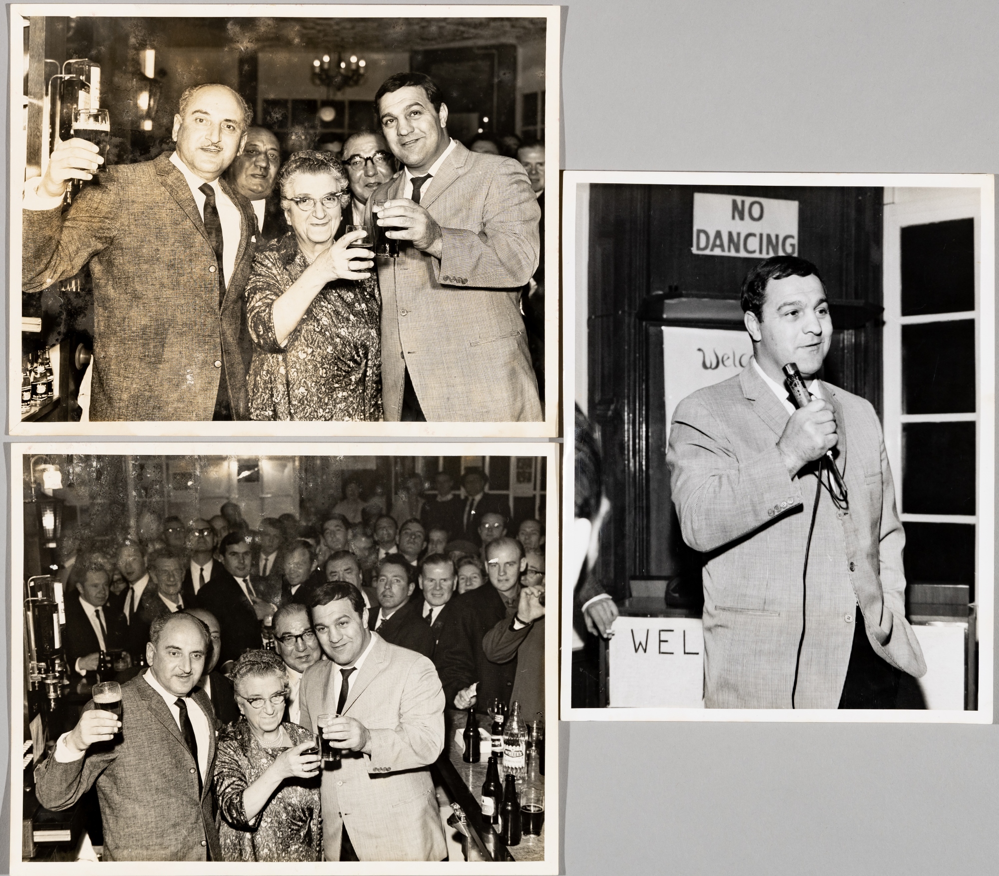 Boxing: Rocky Marciano three b&w 10 by 8in. photographs published by Photonews, Fleet Street, London (circa early 1960’s), depicting Marciano at a speaking engagement at the Lord Palmerston Public House, Fulham, London. All three with handwritten description to verso, good condition.