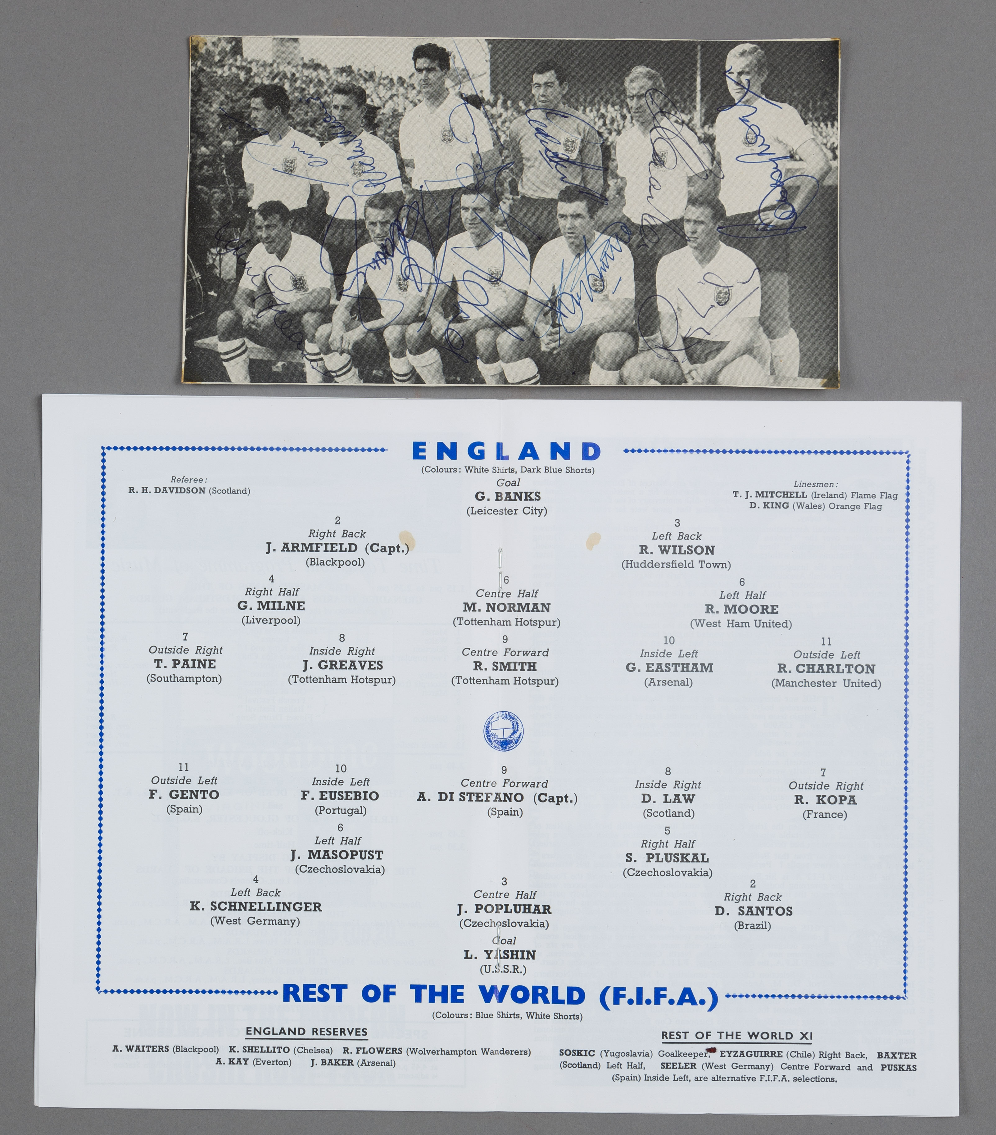 England team-signed b&w photograph from the F.A. Centenary Match v Rest of the World at Wembley, 23rd October 1963, the photo extracted from the programme issued for the match signed in blue and black pen by the England XI, Banks, Armfield, Wilson, Milne, Norman, Moore, Paine, Greaves, Smith, Eastham & Bobby Charlton eight of whom would be in Alf Ramsey's 1966 World Cup winning squad; sold together with a reproduction match programme, (2)